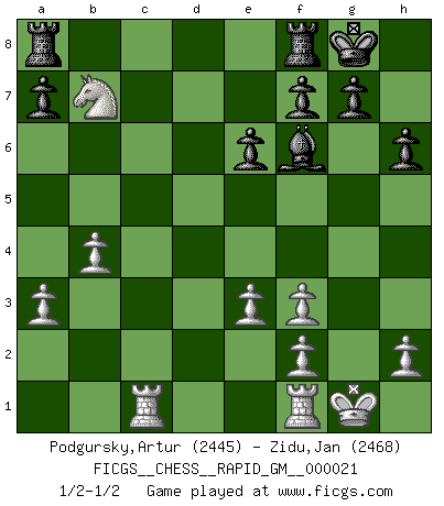 Last move : 1/2-1/2 2025 February 25 15:41:12 [Event "FICGS__CHESS__RAPID_GM__000021"] [Site "FICGS"] [Date "2024.10.26"] [Round "1"] [White "Podgursky,Artur"] [Black "Zidu,Jan"] [Result "1/2-1/2"] [WhiteElo "2445"] [BlackElo "2468"] 1.d4 Nf6 2.Nf3 d5 3.c4 e6 4.Nc3 Bb4 5.Bg5 h6 6.Bxf6 Qxf6 7.e3 O-O 8.Rc1 dxc4 9.Bxc4 c5 10.O-O cxd4 11.Ne4 Qe7 12.Nxd4 Bd7 13.Be2 Nc6 14.a3 Nxd4 15.Qxd4 Ba5 16.Qc5 Qxc5 17.Nxc5 Bc6 18.Bf3 Bxf3 19.gxf3 Bd8 20.Nxb7 Bf6 21.b4 1/2-1/2 Follow this game move after move (download)Those who say they understand Chess, understand nothing. (Robert Hubner) Ich habe Kasparov in Rente geschickt. (Veselin Topalov) Uno no tiene que jugar muy bien, es suficiente jugar mejor que el oponente. (Siegbert Tarrasch) Aidez vos pièces, elles vous aideront. (Paul Morphy) There are two kinds of tragedy in this world, one is not getting what you want and the other is getting. (Lord of war)