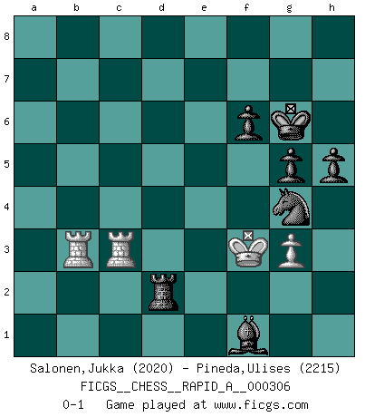 Last move : 0-1 2025 January 21 8:33:10 [Event "FICGS__CHESS__RAPID_A__000306"] [Site "FICGS"] [Date "2024.10.31"] [Round "1"] [White "Salonen,Jukka"] [Black "Pineda,Ulises"] [Result "0-1"] [WhiteElo "2020"] [BlackElo "2215"] 1.d4 d5 2.Nf3 e6 3.Bf4 Nd7 4.Nc3 Bb4 5.Qd3 c5 6.e4 c4 7.Qe2 Ne7 8.g3 dxe4 9.Qxe4 Nf6 10.Qe2 Bxc3+ 11.bxc3 b6 12.Qxc4 O-O 13.Be2 Bb7 14.Qb3 Nc6 15.O-O Na5 16.Qa3 Qd5 17.Rab1 Rac8 18.Rb5 Nc4 19.Qa4 Qe4 20.Re1 a6 21.Rb4 b5 22.Qb3 h6 23.Bd1 Qd5 24.a4 Bc6 25.Bc1 Rfe8 26.Be2 e5 27.h3 exd4 28.axb5 axb5 29.cxd4 Rxe2 30.Rxe2 Qxf3 31.Qxf3 Bxf3 32.Re1 Bc6 33.Rb1 Nd5 34.Ra1 Nb4 35.Re7 Nxc2 36.R1a7 Bd5 37.Rac7 Rb8 38.Rc5 Rd8 39.Bf4 Be6 40.Rxb5 Rxd4 41.Kg2 Ne1+ 42.Kf1 Nd3 43.Be3 Nxe3+ 44.fxe3 Ra4 45.Rb8+ Kh7 46.Ke2 Ne5 47.Rb2 Ra1 48.Rc2 Rh1 49.Rc3 Rxh3 50.e4 Rh2+ 51.Ke1 Rh1+ 52.Ke2 Ra1 53.Re8 Ng4 54.Rb8 Ra4 55.Kf1 Rxe4 56.Rb1 g5 57.Ra1 Bc4+ 58.Kg1 f6 59.Rd1 Kg6 60.Rdc1 Ne5 61.Rb1 h5 62.Rb2 Re1+ 63.Kf2 Rd1 64.Rb4 Ng4+ 65.Kf3 Bf1 66.R4b3 Rd2 0-1 Follow this game move after move (download)For surely of all the drugs in the world, Chess must be the most permanently pleasurable. (Assiac) Bogoljubow: Matt in vier Zügen! Tartakower: Ich verbitte mir jede Belästigung! (Savielly Grigorievitsch Tartakower) Solo puedes ser bueno en el Ajedrez si amas al juego. (Bobby Fischer) Mais n'est-ce pas déjà le limiter injurieusement que d'appeler les échecs un jeu? N'est-ce pas aussi une science, un art, ou quelque chose qui, comme le cercueil de Mahomet entre ciel et terre, est suspendu entre l'un et l'autre, et qui réunit un nombre incroyable de contraires ? (Stefan Zweig) Humor is by far the most significant activity of the human brain. (Edward De Bono)