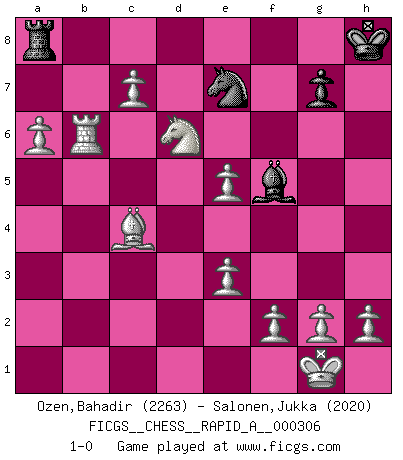 Last move : 1-0 2025 January 2 7:1:59 [Event "FICGS__CHESS__RAPID_A__000306"] [Site "FICGS"] [Date "2024.10.31"] [Round "1"] [White "Ozen,Bahadir"] [Black "Salonen,Jukka"] [Result "1-0"] [WhiteElo "2263"] [BlackElo "2020"] 1.d4 d5 2.Nf3 Nc6 3.e3 Nf6 4.c4 Bg4 5.Qb3 e6 6.Qxb7 Nb4 7.Qb5+ c6 8.Qa4 Bf5 9.Na3 a5 10.c5 Be7 11.Bd2 Qc8 12.Be2 Ne4 13.Qd1 Bf6 14.Bc3 O-O 15.O-O Qb7 16.Nb1 a4 17.Nbd2 a3 18.Nxe4 dxe4 19.Nd2 axb2 20.Bxb2 Rfb8 21.a4 Bd8 22.Nc4 Nd5 23.Qc2 Ba5 24.Bc1 Bc3 25.Ra3 Bb4 26.Rb3 Qc7 27.Rd1 Qa7 28.Bd2 Bxd2 29.Rxb8+ Rxb8 30.Rxd2 Nb4 31.Qc3 h5 32.a5 Nd5 33.Qa1 Ra8 34.Rb2 Kh7 35.Bxh5 Qa6 36.Be2 Bg4 37.Bf1 Bf5 38.Rb1 Ra7 39.Rb8 Nf6 40.Rb6 Qc8 41.a6 Ra8 42.Nd6 Qf8 43.Qb2 Bg6 44.Rxc6 e5 45.dxe5 Nd5 46.Qd4 Ne7 47.Rb6 Qd8 48.Qc4 Ng8 49.Nxf7 Qe8 50.Ng5+ Kh8 51.c6 Ne7 52.c7 Bf5 53.Nxe4 Qg8 54.Nd6 Qxc4 55.Bxc4 1-0 Follow this game move after move (download)The sign of a great Master is his ability to win a won game quickly and painlessly. (Irving Chernev) Drei Punkte vor allen anderen ist wie einer, der im weißen Anzug posiert, während der Rest in Müllsäcke gekleidet dasteht. (Viktor Kortschnoi) Siempre es mucho mejor sacrificar las piezas de tu oponente. (Savielly Tartakover) Il n'y a pas de prix trop élevé au scalp de l'ennemi. (Koblentz) Creativity is allowing yourself to make mistakes. Art is knowing which ones to keep. (Scott Adams)