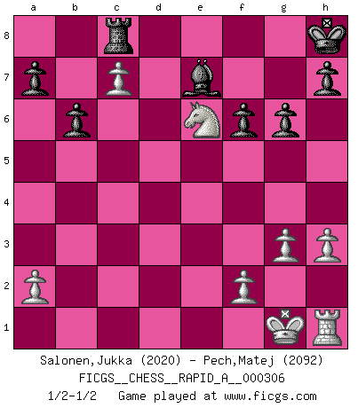 Last move : 1/2-1/2 2025 January 25 20:36:27 [Event "FICGS__CHESS__RAPID_A__000306"] [Site "FICGS"] [Date "2024.10.31"] [Round "1"] [White "Salonen,Jukka"] [Black "Pech,Matej"] [Result "1/2-1/2"] [WhiteElo "2020"] [BlackElo "2092"] 1.d4 Nf6 2.c4 g6 3.Nc3 d5 4.cxd5 Nxd5 5.e4 Nxc3 6.bxc3 Bg7 7.Nf3 c5 8.Be3 Qa5 9.Bd2 O-O 10.h3 Nc6 11.Be2 cxd4 12.cxd4 Qa3 13.Be3 Qb4+ 14.Kf1 Rd8 15.Rb1 Qa3 16.Qd2 b6 17.d5 e6 18.Bg5 f6 19.Bf4 Ba6 20.Kg1 Bxe2 21.Qxe2 exd5 22.exd5 Qe7 23.Qb5 Qe4 24.dxc6 Qxf4 25.Qb3+ Kh8 26.g3 Qe4 27.c7 Rd3 28.Qc2 Rc8 29.Rb3 Re3 30.Qxe4 Rxe4 31.Rd3 R4e8 32.Rd7 Bf8 33.Nd4 Re7 34.Rxe7 Bxe7 35.Ne6 1/2-1/2 Follow this game move after move (download)No Chess Grandmaster is normal; they only differ in the extent of their madness. (Viktor Korchnoi) Ja, jede Frau in Holland liebt mich bestimmt, und alle Männer hassen mich. (Loek van Wely) El Ajedrez es realmente noventa y nueve por ciento calculación. (Soltis) Je fais ceci parce que dans cinquante coups j'obtiendrai cela; je m'appelle Mikhail Moisevitch Botvinnik. (Botvinnik) Life is pain my dear and anyone who says otherwise is selling something. (Princess Bride)