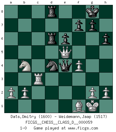 Last move : 1-0 2008 February 27 2:43:30 [Event "FICGS__CHESS__CLASS_D__000059"] [Site "FICGS"] [Date "2007.09.21"] [Round "1"] [White "Dats,Dmitry"] [Black "Weidemann,Jaap"] [Result "1-0"] [WhiteElo "1600"] [BlackElo "1517"] 1.d4 Nf6 2.c4 e6 3.Nc3 d5 4.Bg5 Be7 5.e3 O-O 6.Nf3 h6 7.Bh4 b6 8.Bd3 Bb7 9.Rc1 dxc4 10.Bxc4 Nbd7 11.O-O c5 12.Qe2 Ne4 13.Nxe4 Bxh4 14.Nd6 Bxf3 15.Qxf3 cxd4 16.exd4 Qe7 17.Qc6 Rad8 18.Nb5 a6 19.Nc7 Bg5 20.f4 Bf6 21.Rfd1 Nb8 22.Qxb6 Rd6 23.Qc5 Nc6 24.Nxa6 Bxd4+ 25.Rxd4 Nxd4 26.Nb4 Rfd8 27.Bf1 Qb7 28.Rc3 Qe4 29.Qe5 1-0 This chess game has been lost on time (started : 2007.09.21 15:48:11) Queen's pawn game Kingside Castling by player Black (move 5) Kingside Castling by player White (move 11) Player White won this chess game. Follow this game move after move (download)I play correspondence chess because it is both art and science while chess is art only. (A player at FICGS) Bobby Fischer ist kein Vorbild für die heutige Jugend. (Viktor Kortschnoi) No todos los artistas son jugadores de Ajedrez, pero todos los jugadores de Ajedrez son artistas. (Marcel Duchamp) Si rien de grave n'est détecté lors de l'analyse d'une position, on joue alors le coup. Seconde règle de Blumenfeld. The only sure thing about luck is that it will change. (Wilson Mizner)