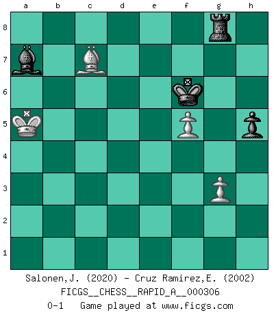 Last move : 0-1 2025 January 25 8:40:50 [Event "FICGS__CHESS__RAPID_A__000306"] [Site "FICGS"] [Date "2024.10.31"] [Round "1"] [White "Salonen,Jukka"] [Black "Cruz Ramirez,Eliecer"] [Result "0-1"] [WhiteElo "2020"] [BlackElo "2002"] 1.d4 d5 2.Nf3 Nf6 3.c4 e6 4.e3 Be7 5.Nc3 O-O 6.Bd3 dxc4 7.Bxc4 c5 8.O-O a6 9.dxc5 Bxc5 10.Bd3 Nbd7 11.e4 Qc7 12.Qe2 Bd6 13.Bd2 b5 14.Rac1 Qb8 15.g3 Bb7 16.Rfd1 h6 17.a3 Ng4 18.b4 Nge5 19.Be3 Nxf3+ 20.Qxf3 Ne5 21.Qe2 Rc8 22.Bd4 Bf8 23.f3 Rd8 24.Be3 Bc6 25.Kg2 Qb7 26.Bf4 Nxd3 27.Rxd3 Rxd3 28.Qxd3 a5 29.bxa5 Bxa3 30.Rb1 b4 31.Na2 Bb5 32.Qd6 Ra6 33.Qd2 b3 34.Nc1 b2 35.Nd3 g5 36.Bxg5 Rd6 37.Bf6 Kh7 38.Qf4 Rxd3 39.Bxb2 Rb3 40.Bd4 Rxb1 41.Qf6 e5 42.Qxe5 f6 43.Qxf6 Bf1+ 44.Kf2 Kg8 45.Qh8+ Kf7 46.Qh7+ Ke6 47.Qxb7 Rxb7 48.Kxf1 Rc7 49.Ke2 Bc5 50.Bh8 Bg1 51.f4 Rc8 52.Bg7 Rc2+ 53.Kd3 Rxh2 54.f5+ Kf7 55.Bc3 Rf2 56.Be5 h5 57.Bd6 Kf6 58.Bc7 Rf3+ 59.Kc4 Bf2 60.a6 Ra3 61.Kb5 Rc3 62.Bd8+ Kf7 63.Ka4 Rc8 64.Bh4 Rc4+ 65.Kb5 Rxe4 66.Bd8 Re8 67.Bc7 Kf6 68.Ka5 Rg8 69.a7 Bxa7 0-1 Follow this game move after move (download)Good positions don't win games, good moves do. (Gerald Abrahams) Wie ich sie so einen nach dem anderen nieder mähte wurde meine Überlegenheit offensichtlich. (José Raúl Capablanca) El Ajedrez es una hermosa aventura. (Bent Larsen) On a dit que l'homme se distingue de l'animal par le fait qu'il achète plus de livres qu'il ne peut en lire. Je voudrais suggérer qu'inclure à la liste des livres quelques livres d'échecs rendrait la distinction manifeste. (Edward Lasker) Success without honor is an unseasoned dish; it will satisfy your hunger, but it won't taste good. (Joe Paterno)