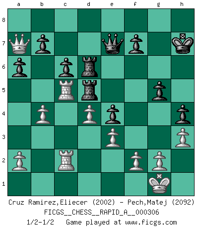 Last move : 1/2-1/2 2025 January 7 10:43:21 [Event "FICGS__CHESS__RAPID_A__000306"] [Site "FICGS"] [Date "2024.10.31"] [Round "1"] [White "Cruz Ramirez,Eliecer"] [Black "Pech,Matej"] [Result "1/2-1/2"] [WhiteElo "2002"] [BlackElo "2092"] 1.d4 d5 2.c4 e6 3.Nc3 Nf6 4.cxd5 exd5 5.Bg5 Be7 6.e3 h6 7.Bh4 c6 8.Bd3 O-O 9.Qc2 Re8 10.Nge2 Nbd7 11.O-O Ne4 12.Bxe7 Qxe7 13.Bxe4 dxe4 14.Rac1 Nf6 15.h3 Bf5 16.Rfd1 Rad8 17.Qa4 a6 18.Qa5 Be6 19.b3 Kh7 20.Rd2 Bd5 21.Nf4 g5 22.Ncxd5 Nxd5 23.Nxd5 Rxd5 24.Rc5 Red8 25.Rdc2 h5 26.b4 h4 27.Qb6 R8d6 28.Qa7 1/2-1/2 Follow this game move after move (download)Dazzling combinations are for the many, shifting wood is for the few. (Georg Kieninger) Das Schach hält seine Meister in eigenen Banden, Fesseln; auf vielerlei Weise formt es ihren Geist, so dass die innere Freiheit selbst des Stärksten beeinflusst wird. (Albert Einstein) Solo puedes ser bueno en el Ajedrez si amas al juego. (Bobby Fischer) Horreur, mais aussi harmonie suprême : qu'y avait-il en effet au monde en dehors des échecs ? Le brouillard, l'inconnu, le non-être... (Vladimir Nabokov) It's unlucky to be superstitious. (Dave Enteles)