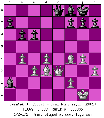 Last move : 1/2-1/2 2025 January 10 5:44:18 [Event "FICGS__CHESS__RAPID_A__000306"] [Site "FICGS"] [Date "2024.10.31"] [Round "1"] [White "Swiatek,Janusz"] [Black "Cruz Ramirez,Eliecer"] [Result "1/2-1/2"] [WhiteElo "2237"] [BlackElo "2002"] 1.e4 e5 2.Nf3 Nc6 3.Bb5 Nf6 4.O-O Nxe4 5.Re1 Nd6 6.Nxe5 Be7 7.Bf1 Nxe5 8.Rxe5 O-O 9.d4 Bf6 10.Re1 Re8 11.Bf4 Rxe1 12.Qxe1 Ne8 13.c3 d5 14.Nd2 Bf5 15.Qe3 c6 16.Re1 Nd6 17.Nb3 b6 18.g4 Be6 19.Nd2 Qd7 20.h3 Re8 21.Qg3 Be7 22.Bd3 Bf8 23.b4 Ne4 24.Nxe4 dxe4 25.Rxe4 Bxa2 26.Rxe8 Qxe8 27.Qe3 1/2-1/2 Follow this game move after move (download)Chess mastery essentially consists of analyzing Chess positions accurately. (Mikhail Botvinnik) Man kann eine Schachpartie nur gewinnen, wenn das Gleichgewicht gestört ist. In einer Stellung mit ungestörtem Gleichgewicht ist auch das größte Genie hilflos - in der Stellung steckt dann eben kein genialer Einfall. (Wilhelm Steinitz) La batalla por la última verdad nunca sera ganada. Y es por eso que el Ajedrez es tan fascinante. (Hans Kmoch) L'attaque fait le spectacle, la défense gagne les matchs. (Dicton footballistique) Never was anything great achieved without danger. (Niccolo Machiavelli)