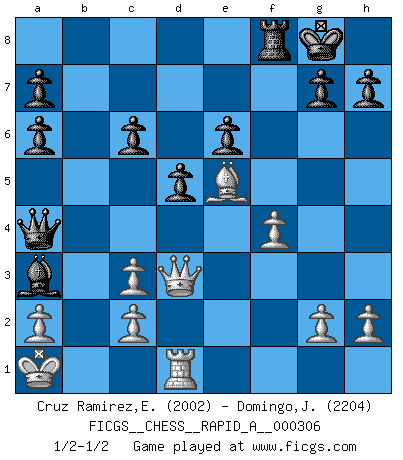 Last move : 1/2-1/2 2024 December 2 18:55:13 [Event "FICGS__CHESS__RAPID_A__000306"] [Site "FICGS"] [Date "2024.10.31"] [Round "1"] [White "Cruz Ramirez,Eliecer"] [Black "Domingo,Jordi"] [Result "1/2-1/2"] [WhiteElo "2002"] [BlackElo "2204"] 1.e4 e5 2.Nf3 d6 3.d4 exd4 4.Nxd4 Nf6 5.Nc3 Be7 6.Bf4 O-O 7.Qd2 d5 8.Ndb5 Bb4 9.O-O-O c6 10.Nc7 Nxe4 11.Qe3 Nxc3 12.bxc3 Ba3+ 13.Kb1 Na6 14.Bxa6 bxa6 15.Nxa8 Qa5 16.Ka1 Be6 17.Qd3 Rxa8 18.Rhe1 Qa4 19.Bc7 Rc8 20.Rxe6 fxe6 21.Be5 Rf8 22.f4 1/2-1/2 Follow this game move after move (download)Before the endgame, the Gods have placed the middle game. (Siegbert Tarrasch) Die starken Figuren des Gegners muss man abtauschen. (José Raúl Capablanca) Robert Fischer es la ley hacia si mismo. (Larry Evans) Les pièces de l'échiquier étaient impitoyables. Elles le retenaient, elles l'absorbaient. Il y avait de l'horreur en cela, mais aussi une harmonie unique. Car, qu'y a-t-il dans le monde, à part les échecs ? (V. Nabokov) The ultimate in disposing one's troops is to be without ascertainable shape. Then the most penetrating spies cannot pry in nor can the wise lay plans against you. (Sun Tzu)