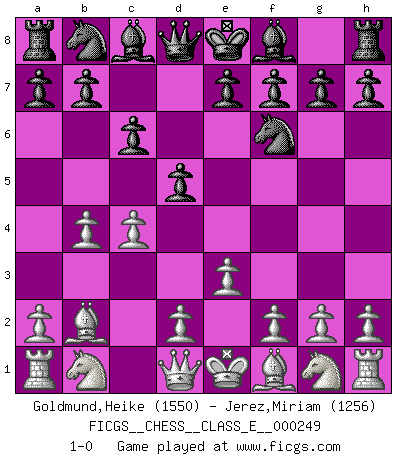 Last move : 1-0 2024 December 13 19:40:9 [Event "FICGS__CHESS__CLASS_E__000249"] [Site "FICGS"] [Date "2024.11.01"] [Round "1"] [White "Goldmund,Heike"] [Black "Jerez,Miriam"] [Result "1-0"] [WhiteElo "1550"] [BlackElo "1256"] 1.b4 d5 2.Bb2 c6 3.e3 Nf6 4.c4 1-0 This chess game has been lost on time (started : 2024.11.01 10:41:21) Follow this game move after move (download)My God, Bobby Fischer plays so simply. (Alexei Suetin) Ich verachte Kasparow. (Viktor Kortschnoi) El Ajedrez es una guerra en un tablero. El objetivo es aplastar la mente del oponente. (Bobby Fischer) Les Echecs représentent une sphère d'idées créatrices basée sur la volonté des deux protagonistes. (Smyslov) Gambling : The sure way of getting nothing from something. (Wilson Mizner)