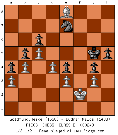 Last move : 1/2-1/2 2025 February 14 16:25:28 [Event "FICGS__CHESS__CLASS_E__000249"] [Site "FICGS"] [Date "2024.11.01"] [Round "1"] [White "Goldmund,Heike"] [Black "Budnar,Milos"] [Result "1/2-1/2"] [WhiteElo "1550"] [BlackElo "1488"] 1.d4 d5 2.Nf3 Bg4 3.e3 e5 4.Be2 Bxf3 5.Bxf3 e4 6.Be2 Bb4 7.Bd2 Bxd2 8.Qxd2 a6 9.c4 Nf6 10.Nc3 c6 11.O-O O-O 12.b3 b5 13.c5 g6 14.b4 a5 15.a3 a4 16.f3 exf3 17.Rxf3 Ne4 18.Nxe4 dxe4 19.Rf4 Qd5 20.Qc2 f5 21.g4 Qb3 22.Qa2 Qxa2 23.Rxa2 Nd7 24.Bf1 Rae8 25.Rg2 Re6 26.gxf5 Ref6 27.R2g4 Rxf5 28.Rxf5 Rxf5 29.Bh3 Rf3 30.Rg3 Rxg3 31.hxg3 Nf6 32.Kg2 h5 33.Be6+ Kg7 34.Kh3 g5 35.Bf5 Kh6 36.Kg2 g4 37.Bc8 Nd5 38.Kf2 Ne7 39.Bd7 Kg5 40.Be8 1/2-1/2 Follow this game move after move (download)Winning isn't everything... but losing is nothing. (Mednis) Das ganze Leben mit einer Ehefrau ist wie ein Endspiel mit ungleichfarbigen Läufern. (Viktor Kortschnoi) El Jaque al descubierto es el bombardero del tablero. (Reuben Fine) Il (Jacob Murray) ne joue pas pour le bon coup, mais pour le meilleur. (Eloi Relange) Life doesn't imitate art, it imitates bad television. (Woody Allen)