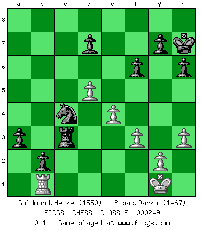 Last move : 0-1 2025 March 18 13:13:54 [Event "FICGS__CHESS__CLASS_E__000249"] [Site "FICGS"] [Date "2024.11.01"] [Round "1"] [White "Goldmund,Heike"] [Black "Pipac,Darko"] [Result "0-1"] [WhiteElo "1550"] [BlackElo "1467"] 1.b4 e5 2.Bb2 Bxb4 3.Bxe5 Nf6 4.a3 Bd6 5.Bxd6 cxd6 6.e3 O-O 7.Nf3 b6 8.c4 Ba6 9.d3 Re8 10.Be2 d5 11.O-O dxc4 12.d4 Qc7 13.Nc3 Nc6 14.Qa4 Qb7 15.Bxc4 Bxc4 16.Qxc4 Rac8 17.Qb3 h6 18.Rfc1 Na5 19.Qc2 Nd5 20.Qb2 Nxc3 21.Rxc3 Rxc3 22.Qxc3 Rc8 23.Qb4 Qd5 24.Ne5 Rc7 25.h3 Kh7 26.f3 f6 27.Nd3 Qb3 28.Qxb3 Nxb3 29.Rb1 Nd2 30.Rb2 Nc4 31.Rc2 a5 32.Nf4 Rc6 33.d5 Rc5 34.e4 Nxa3 35.Rb2 b5 36.Nd3 Rc3 37.Nf2 b4 38.Kh2 b3 39.Nd1 Nc4 40.Rb1 Rd3 41.Nf2 Rd2 42.Nd1 b2 43.Kg1 a4 44.Nc3 a3 45.Kf1 Rc2 46.Kg1 Rxc3 0-1 Follow this game move after move (download)No price is too great for the scalp of the enemy King. (Koblentz) Fallen sollten polizeilich verboten werden. (Savielly Grigorievitsch Tartakower) Aquel que ve no otra dirección en el juego que la de dar Jaque Mate a su oponente, nunca será un buen jugador de Ajedrez. (Euwe) La vérité est comme le meilleur coup aux échecs : elle existe, mais il faut la chercher. (Arturo Perez-Reverte) Creativity is allowing yourself to make mistakes. Art is knowing which ones to keep. (Scott Adams)