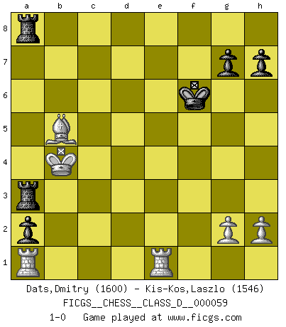 Last move : 1-0 2007 November 29 5:14:44 [Event "FICGS__CHESS__CLASS_D__000059"] [Site "FICGS"] [Date "2007.09.21"] [Round "1"] [White "Dats,Dmitry"] [Black "Kis-Kos,Laszlo"] [Result "1-0"] [WhiteElo "1600"] [BlackElo "1546"] 1.e4 c5 2.Nf3 d6 3.d4 cxd4 4.Nxd4 Nf6 5.Nc3 a6 6.Bg5 e6 7.f4 Qc7 8.Qf3 b5 9.O-O-O b4 10.e5 Bb7 11.Ncb5 axb5 12.Bxb5+ Nbd7 13.Qh3 b3 14.exf6 bxa2 15.Kd2 Bd5 16.Rhe1 Qa7 17.Nxe6 Qf2+ 18.Kd3 fxe6 19.f7+ Kxf7 20.Bxd7 Bc4+ 21.Kxc4 Qxc2+ 22.Kd4 Qxb2+ 23.Qc3 e5+ 24.fxe5 dxe5+ 25.Kc4 Qxc3+ 26.Kxc3 Ra7 27.Bb5 Ra3+ 28.Kc4 Be7 29.Bxe7 Kxe7 30.Rxe5+ Kf6 31.R5e1 Rc8+ 32.Kb4 Rca8 33.Ra1 1-0 Sicilian : Najdorf, 7.f4 Queenside Castling by player White (move 9) Player White won this chess game. Follow this game move after move (download)It is not a move, even the best move that you must seek, but a realizable plan. (Eugene Znosko-Borovsky) Kasparov ist eine Art Monster mit hundert Augen, denen auch nicht das Geringste entgeht. (Tony Miles) Un buen jugador siempre tiene buena suerte. (José Raúl Capablanca) Aucun coup ne doit être joué sans but. (Pedro Damiano) Mac users swear by their computers. PC users swear at their computers. (Author unknown)