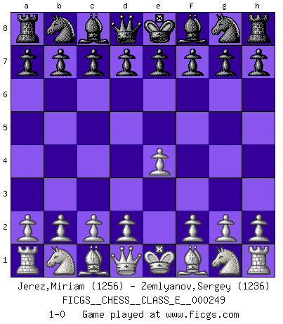 Last move : 1-0 2024 December 13 0:4:43 [Event "FICGS__CHESS__CLASS_E__000249"] [Site "FICGS"] [Date "2024.11.01"] [Round "1"] [White "Jerez,Miriam"] [Black "Zemlyanov,Sergey"] [Result "1-0"] [WhiteElo "1256"] [BlackElo "1236"] 1.e4 1-0 This chess game has been lost on time (started : 2024.11.01 10:41:21) Follow this game move after move (download)The defensive power of a pinned piece is only imaginary. (Aaron Nimzovich) Garry Kasparov war erst in der Großmeister-Organisation GMA, dann in der Profischach-Vereinigung PCA, zum Schluss kehrte er wieder in den Schoß der FIDE zurück. Aber gut, manche Leute sind flexibel (Viswanathan Anand) Repentinamente, me resultaba obvio en mi analisis que yo había pasado por alto lo que Fischer había visto en el tablero con la mas grande facilidad. (Mikhail Botvinnik) Soyez une menace à chaque fois que vous vous asseyez pour jouer. (Ken Smith) As a goal marker shodan is important. As a destination it is a poor place to stop. (Thomas Tamayo)