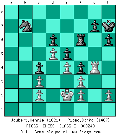 Last move : 0-1 2025 February 5 7:24:24 [Event "FICGS__CHESS__CLASS_E__000249"] [Site "FICGS"] [Date "2024.11.01"] [Round "1"] [White "Joubert,Hennie"] [Black "Pipac,Darko"] [Result "0-1"] [WhiteElo "1621"] [BlackElo "1467"] 1.e4 e5 2.Bc4 Nc6 3.Nc3 a6 4.d4 Bb4 5.Nf3 d6 6.O-O Bxc3 7.bxc3 Bg4 8.d5 Na5 9.Bb3 Nf6 10.Bg5 h6 11.Bxf6 Qxf6 12.Qd3 Bxf3 13.Qxf3 Qxf3 14.gxf3 b5 15.Kg2 O-O 16.Rg1 c5 17.a3 c4 18.Ba2 f5 19.Kf1 f4 20.Ke2 Nb7 21.Rg6 Kh7 22.Rag1 Rf7 23.R1g2 Rd8 24.a4 R8d7 25.axb5 axb5 26.R6g4 Nc5 27.Rg1 Rf6 28.Rb1 Rb7 29.Bxc4 bxc4 30.Rxb7 Nxb7 0-1 Follow this game move after move (download)Chess is a part of culture and if a culture is declining then Chess too will decline. (Mikhail Botvinnik) Es gibt Leute, die glauben, alles wäre vernünftig, was man mit einem ernsthaften Gesicht tut. (Georg Christoph Lichtenberg) Ser exitoso en el Ajedrez te permite descubrir tu propia personalidad. Eso es lo que deseo para los niños de mi clase. (Saudin Robovic) Tous ces prétendus hommes politiques sont les pions, les Cavaliers, les Tours ou les Fous d'une partie d'échecs qui se jouera tant qu'un hasard ne renversera pas l'échiquier. (Honoré de Balzac) Any activity becomes creative when the doer cares about doing it right or doing it better. (John Updike)