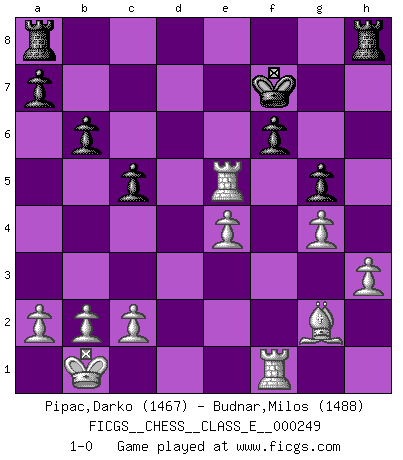 Last move : 1-0 2025 January 4 13:26:49 [Event "FICGS__CHESS__CLASS_E__000249"] [Site "FICGS"] [Date "2024.11.01"] [Round "1"] [White "Pipac,Darko"] [Black "Budnar,Milos"] [Result "1-0"] [WhiteElo "1467"] [BlackElo "1488"] 1.e4 e5 2.Nf3 d6 3.h3 h6 4.Nc3 c6 5.d4 Nd7 6.dxe5 Nxe5 7.Nxe5 dxe5 8.Qxd8+ Kxd8 9.f4 Bd6 10.fxe5 Bxe5 11.Bd2 Nf6 12.O-O-O Be6 13.Bxh6 Nd7 14.Bg5+ f6 15.Be3 Ke7 16.g4 g5 17.Bd4 Bf4 18.Kb1 Be5 19.Bg2 c5 20.Bxe5 Nxe5 21.Nd5+ Kf7 22.Rhf1 Bxd5 23.Rxd5 b6 24.Rxe5 1-0 Follow this game move after move (download)Human affairs are like a Chess game: only those who do not take it seriously can be called good players. (Hung Tzu Ch'eng) Intelligenz läßt sich nicht am Weg, sondern nur am Ergebnis feststellen. (Garry Kasparov) Las piezas de Ajedrez son los bloques del alfabeto que moldean los pensamientos; y esos pensamientos, aunque hagan un diseño visual en el tablero, expresan abstractamente su belleza como un poema. (Marcel Duchamp) Les pièces de l'échiquier étaient impitoyables. Elles le retenaient, elles l'absorbaient. Il y avait de l'horreur en cela, mais aussi une harmonie unique. Car, qu'y a-t-il dans le monde, à part les échecs ? (V. Nabokov) Perhaps the current trend of many chess professionals taking up the more lucrative pastime of poker is not a wholly negative one. It may not be too late for humans to relearn how to take risks in order to innovate and thereby maintain the advanced lifestyles we enjoy. And if it takes a poker-playing supercomputer to remind us that we can't enjoy the rewards without taking the risks, so be it. (The Chess Master and the Computer, by Garry Kasparov - 2010)