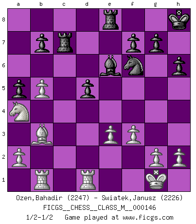 Last move : 1/2-1/2 2025 January 8 22:1:40 [Event "FICGS__CHESS__CLASS_M__000146"] [Site "FICGS"] [Date "2024.11.04"] [Round "1"] [White "Ozen,Bahadir"] [Black "Swiatek,Janusz"] [Result "1/2-1/2"] [WhiteElo "2247"] [BlackElo "2226"] 1.d4 d5 2.c4 e6 3.Nc3 Nf6 4.cxd5 exd5 5.Bg5 c6 6.e3 h6 7.Bh4 Be7 8.Bd3 O-O 9.Qc2 Nbd7 10.Nf3 Re8 11.O-O Ne4 12.Bxe4 Bxh4 13.Bh7+ Kh8 14.Nxh4 Qxh4 15.Bd3 Qe7 16.Rab1 Nf6 17.b4 a5 18.b5 c5 19.dxc5 Qxc5 20.Na4 Qxc2 21.Bxc2 Be6 22.Rfd1 Rac8 23.Bb3 Rc7 24.f3 1/2-1/2 Follow this game move after move (download)It's just you and your opponent at the board and you're trying to prove something. (Bobby Fischer) Ich spiele ehrlich und spiele, um zu gewinnen. Wenn ich verliere nehme ich meine Medizin. (Robert James Fischer) El Ajedrez detiene a su maestro dentro de sus propios vínculos, encadenando la mente y el cerebro, por lo que la libertad interior del mas fuerte debe sufrir. (Albert Einstein) Le moment que je préfère le plus dans une rencontre, c'est celui où je sens que la personnalité de l'adversaire se brise. (Robert Fischer) Knowledge will give you power, but character respect. (Bruce Lee)