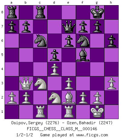 Last move : 1/2-1/2 2024 November 13 1:40:37 [Event "FICGS__CHESS__CLASS_M__000146"] [Site "FICGS"] [Date "2024.11.04"] [Round "1"] [White "Osipov,Sergey"] [Black "Ozen,Bahadir"] [Result "1/2-1/2"] [WhiteElo "2276"] [BlackElo "2247"] 1.d4 d5 2.c4 c6 3.Nf3 Nf6 4.cxd5 cxd5 5.Nc3 Nc6 6.Bf4 Bf5 7.e3 e6 8.Be2 Bb4 9.O-O O-O 10.Rc1 h6 11.h3 Bd6 12.Bxd6 Qxd6 13.Qb3 Qe7 14.Nd2 Rfc8 15.Rfe1 Rc7 16.Nb5 R7c8 17.Nc3 Rc7 18.Nb5 R7c8 19.Nc3 1/2-1/2 Follow this game move after move (download)I play correspondence chess because it is both art and science while chess is art only. (A player at FICGS) Ich würde die 30 stärksten Spieler der USA im Simultanspiel besiegen. (José Raúl Capablanca) Vive, pierde y aprende al observar a tu oponente como ganar. (Amber Steenbock) Ce qui est bien, c'est d'avoir tout un tas de pièces en prise : l'adversaire ne peut en prendre qu'une à la fois. Cité par Thierry Audin. To err is human, but to really foul things up requires a computer. (Farmer's Almanac, 1978)