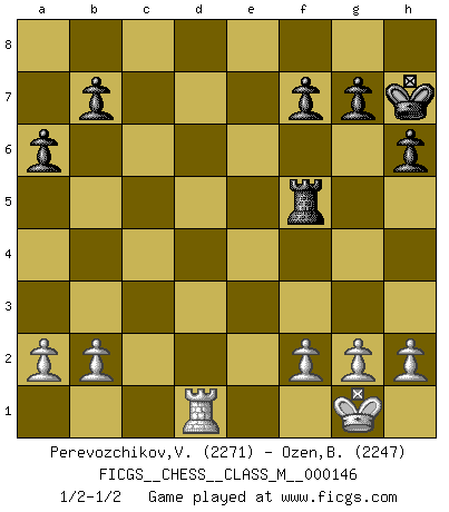 Last move : 1/2-1/2 2024 November 16 13:51:1 [Event "FICGS__CHESS__CLASS_M__000146"] [Site "FICGS"] [Date "2024.11.04"] [Round "1"] [White "Perevozchikov,Vjacheslav"] [Black "Ozen,Bahadir"] [Result "1/2-1/2"] [WhiteElo "2271"] [BlackElo "2247"] 1.d4 d5 2.Nf3 Nf6 3.c4 dxc4 4.e3 e6 5.Bxc4 c5 6.O-O a6 7.Re1 Nc6 8.Nc3 Be7 9.Bd3 cxd4 10.exd4 O-O 11.Ne5 Nxd4 12.Bf4 h6 13.Qd2 Nd7 14.Rad1 Nxe5 15.Bxe5 Bg5 16.Bf4 Qf6 17.Be3 Bxe3 18.Qxe3 Nf5 19.Bxf5 Qxf5 20.Qb6 e5 21.Nd5 Kh7 22.Qc7 Be6 23.Rxe5 Rac8 24.Qxc8 Rxc8 25.Rxf5 Bxf5 26.Ne7 Rc5 27.Nxf5 Rxf5 1/2-1/2 Follow this game move after move (download)One bad move nullifies forty good ones. (Horowitz) Nicht daß Diemer aus Opportunismus Mitglied der NSDAP geworden wäre. Er war ein Fanatiker, in allem, was er tat. (Hans Ree) Un Peón pasado aumenta su poder a medida de que el número de piezas en el tablero disminuye. (Capablanca) La tactique, c'est ce que vous faites quand il y a quelque chose à faire; la stratégie, c'est ce que vous faites quand il n'y a rien à faire. (Savielli Tartacower) Wisdom doesn't necessarily come with age. Sometimes age just shows up all by itself. (Tom Watson)