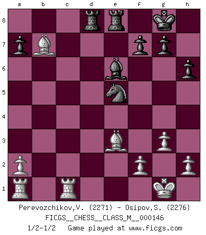 Last move : 1/2-1/2 2024 November 13 21:28:38 [Event "FICGS__CHESS__CLASS_M__000146"] [Site "FICGS"] [Date "2024.11.04"] [Round "1"] [White "Perevozchikov,Vjacheslav"] [Black "Osipov,Sergey"] [Result "1/2-1/2"] [WhiteElo "2271"] [BlackElo "2276"] 1.c4 e5 2.Nc3 Nf6 3.g3 Bb4 4.Bg2 O-O 5.d3 Re8 6.e4 c6 7.Nge2 d5 8.cxd5 cxd5 9.exd5 Nxd5 10.O-O Be6 11.d4 Nc6 12.dxe5 Nxc3 13.Nxc3 Bxc3 14.bxc3 Qa5 15.Bf4 Qxc3 16.Qc1 Qxc1 17.Rfxc1 Rad8 18.Be3 Nxe5 19.Bxb7 h6 1/2-1/2 Follow this game move after move (download)Bobby is the finest Chess player this country ever produced. His memory for the moves, his brilliance in dreaming up combinations, and his fierce determination to win are uncanny. (John Collins) Schach ist Kampf, hauptsächlich jedoch gegen die eigenen Fehler. (Savielly Grigorievitsch Tartakower) Los Peones son el alma de una partida de Ajedrez. (Francois Andre Danican Philidor) Je ne suis pas le dernier à jouer lâchement des coups douteux pendant le zeïtnot de l'adversaire pour l'achever: en effet les coups qui font le plus peur sont ceux que l'on ne comprend pas. Je me fais souvent peur quand je joue. (Un professeur anonyme) There are lots of people who mistake their imagination for their memory. (Josh Bilings)
