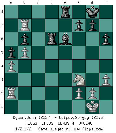 Last move : 1/2-1/2 2025 March 31 12:20:4 [Event "FICGS__CHESS__CLASS_M__000146"] [Site "FICGS"] [Date "2024.11.04"] [Round "1"] [White "Dyson,John"] [Black "Osipov,Sergey"] [Result "1/2-1/2"] [WhiteElo "2227"] [BlackElo "2276"] 1.e4 e5 2.Nf3 Nc6 3.Bc4 Nf6 4.d4 exd4 5.e5 Ne4 6.Qe2 Nc5 7.c3 d3 8.Qe3 Be7 9.b4 Ne6 10.O-O d6 11.exd6 cxd6 12.Qxd3 O-O 13.Be3 Bf6 14.a3 a5 15.b5 Ne7 16.Rd1 d5 17.Bxd5 Qxd5 18.Qxd5 Nxd5 19.Rxd5 Nc7 20.Rc5 Rd8 21.Nbd2 Nd5 22.Bg5 Bxg5 23.Nxg5 b6 24.Rc4 Nxc3 25.Rxc3 Rxd2 26.a4 Bd7 27.Nf3 Rd5 28.Rc7 Re8 29.Rb7 Rd6 30.h3 h6 31.Ra2 Be6 1/2-1/2 Follow this game move after move (download)Without error there can be no brilliancy. (Emanuel Lasker) Der Verteidiger gebe der Gewalt nach, aber nur der Gewalt. Er schaffe sich nicht freiwillig, etwa aus Blindheit oder aus Schrecken, irgendwelche Schwächen. Er lasse sich nicht bluffen. (Emanuel Lasker) El ganar no lo es todo... pero el perder es nada. (Mednis) Il n'y a pas eu de défaite parce que je ne crois pas que cet ordinateur ait jamais existé. IBM a triché en refusant d'imprimer les modes de recherche de la machine. C'est évident, pendant le match, des coups décisifs ont été joués par des êtres humains. Aujourd'hui, les meilleurs spécialistes en informatique ne peuvent toujours pas expliquer comment Deep-Blue a pu jouer contre la logique des ordinateurs. IBM a gagné une guerre de communication, mais ils sont incapables de prouver que l'ordinateur a gagné tout seul. (Garry Kasparov) Bobby never cared about money, though. His only desire was to prove that his choices were correct: He wanted chess to be important because he was a chess player, and he wanted to be important. Bobby knew money was important, but he didn't have a clue why, outside of clothes and status. The only way he could accomplish what he wanted was to fight for a lot of money. Once he got it, he gave it away. He did not know how to spend it. And once he'd become champion, after, essentially, sacrificing his life for it, he didn't know how to spend his time. (Bob Wade)