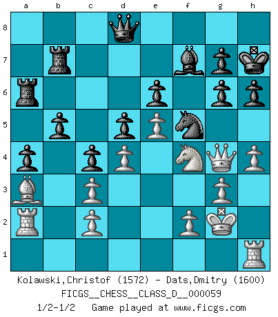 Last move : 1/2-1/2 2007 December 4 21:57:59 [Event "FICGS__CHESS__CLASS_D__000059"] [Site "FICGS"] [Date "2007.09.21"] [Round "1"] [White "Kolawski,Christof"] [Black "Dats,Dmitry"] [Result "1/2-1/2"] [WhiteElo "1572"] [BlackElo "1600"] 1.e4 e6 2.d4 d5 3.Nc3 Bb4 4.e5 c5 5.a3 Bxc3+ 6.bxc3 Ne7 7.Qg4 O-O 8.Bd3 Nbc6 9.Qh5 Ng6 10.Nf3 Qc7 11.Be3 c4 12.Bxg6 fxg6 13.Qg4 Qf7 14.Ng5 Qe8 15.h4 Bd7 16.O-O Ne7 17.a4 h6 18.Nh3 Nf5 19.Bc1 Bxa4 20.Ra2 Kh7 21.Ba3 Rf7 22.Bc5 b6 23.Ba3 Rb7 24.g3 Qf7 25.Nf4 Be8 26.Rb1 a5 27.Rab2 Ra6 28.Bc5 b5 29.Ra1 a4 30.Re1 Qc7 31.Kg2 Bf7 32.Rh1 Qd8 33.Ra2 Rb8 34.Ba3 Qa5 35.Bb4 Qd8 36.Ba3 Rb7 1/2-1/2 French : Winawer, Advance, poisoned pawn variation Kingside Castling by player Black (move 7) Kingside Castling by player White (move 16) This chess game ended in a draw. Follow this game move after move (download)You know, comrade Pachman, I don't enjoy being a Minister, I would rather play Chess like you. (Che Guevara) Ja, ich habe einmal eine Blitzpartie gespielt, es war in einem Zug, 1929. --im Interview 1989 (Mikhail Moiseyevich Botvinik) La estratégia requiere pensar, la táctica requiere observación. (Max Euwe) Echiquier : carré parfait, comme la Jérusalem nouvelle décrite par l'auteur de l'Apocalypse, huit cases sur huit, exaltation du chiffre 4, symbole du cosmos aux quatre horizons... où le noir et le blanc, l'ombre et la lumière, le mal et le bien s'entremêlent et se conjuguent. (Robert Couffignal, Le Gambit du poète) Inventor: A person who makes an ingenious arrangement of wheels, levers and springs, and believes it civilization. (Ambrose Bierce, The Devil's Dictionary)