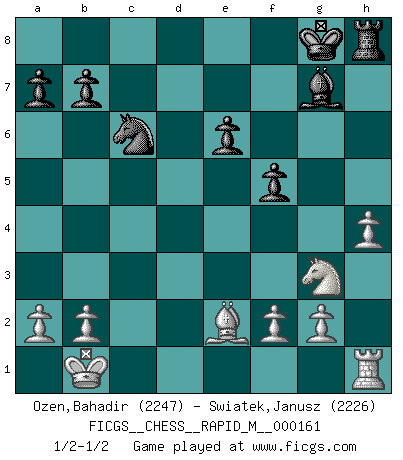 Last move : 1/2-1/2 2025 January 6 21:42:25 [Event "FICGS__CHESS__RAPID_M__000161"] [Site "FICGS"] [Date "2024.11.06"] [Round "1"] [White "Ozen,Bahadir"] [Black "Swiatek,Janusz"] [Result "1/2-1/2"] [WhiteElo "2247"] [BlackElo "2226"] 1.Nf3 d5 2.d4 Nf6 3.c4 e6 4.Nc3 c5 5.cxd5 cxd4 6.Qxd4 exd5 7.e4 dxe4 8.Qxd8+ Kxd8 9.Ng5 Be6 10.Nxe6+ fxe6 11.Bg5 h6 12.Bxf6+ gxf6 13.O-O-O Ke7 14.Nxe4 Bg7 15.Ng3 h5 16.Re1 Kf7 17.h4 f5 18.Kb1 Nc6 19.Be2 Rad8 20.Bxh5+ Kg8 21.Bf3 Rd2 22.Re2 Rxe2 23.Bxe2 1/2-1/2 Follow this game move after move (download)Life is a kind of Chess, with struggle, competition, good and ill events. (Benjamin Franklin) Woher wissen wir, daß der Neanderthaler Blindschach gespielt hat? -- Bei Ausgrabungen wurden keine Schachbretter und Figuren gefunden. (Anonymous) Aquellos que dicen entender al Ajedrez, no entienden nada. (Robert Hubner) Ce qui caractérise les parties de combat, c'est que si le défenseur a constamment de difficiles problèmes à résoudre, l'attaquant doit chercher sans relâche de nouvelles possibilités d'attaque. (Koblentz) The next best thing to gambling and winning is gambling and loosing. (Nick Dandalos)
