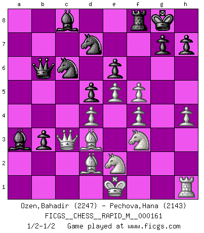 Last move : 1/2-1/2 2025 January 13 23:28:18 [Event "FICGS__CHESS__RAPID_M__000161"] [Site "FICGS"] [Date "2024.11.06"] [Round "1"] [White "Ozen,Bahadir"] [Black "Pechova,Hana"] [Result "1/2-1/2"] [WhiteElo "2247"] [BlackElo "2143"] 1.e4 e6 2.d4 d5 3.Nc3 Nf6 4.e5 Nfd7 5.f4 c5 6.Nce2 Nc6 7.c3 Qb6 8.Nf3 f6 9.a3 Be7 10.h4 O-O 11.b4 cxd4 12.cxd4 Qc7 13.Qc2 b5 14.Ng3 Qb6 15.Bd3 f5 16.Ne2 a5 17.bxa5 Rxa5 18.Bd2 Rxa3 19.Rxa3 Bxa3 20.g4 b4 21.gxf5 b3 22.Qc3 1/2-1/2 Follow this game move after move (download)When you play Bobby, it is not a question if you win or lose. It is a question if you survive. (Boris Spassky) Es gibt zwei Arten von Opfern: Korrekte und meine. (Mikhail Nekhemyevich Tal) Es el objetivo de la escuela moderna no tratar cada posición de acuerdo a una regla general, sino de acuerdo al principio inherente en la posición. (Richard Reti) Il (Jacob Murray) ne joue pas pour le bon coup, mais pour le meilleur. (Eloi Relange) Two beer, or not two beer. (Unknown)