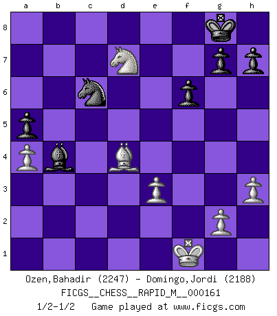 Last move : 1/2-1/2 2024 December 15 20:39:12 [Event "FICGS__CHESS__RAPID_M__000161"] [Site "FICGS"] [Date "2024.11.06"] [Round "1"] [White "Ozen,Bahadir"] [Black "Domingo,Jordi"] [Result "1/2-1/2"] [WhiteElo "2247"] [BlackElo "2188"] 1.Nf3 d5 2.d4 c5 3.c4 dxc4 4.e3 e6 5.Bxc4 Nf6 6.O-O a6 7.b3 Nbd7 8.Bb2 Be7 9.dxc5 Bxc5 10.Nbd2 b6 11.a3 Bb7 12.Qe2 O-O 13.Bd3 Be7 14.h3 b5 15.a4 Nc5 16.Bc2 bxa4 17.bxa4 a5 18.Rfd1 Ba6 19.Nc4 Qb8 20.Nfe5 Rc8 21.Rdc1 Nb3 22.Bxb3 Qxb3 23.Bd4 Qb7 24.Qd1 Bxc4 25.Nxc4 Nd5 26.Rab1 Nb4 27.Nb6 Rxc1 28.Rxc1 Rd8 29.Qg4 Bf8 30.Qf4 f6 31.Rc7 e5 32.Rxb7 exf4 33.Kf1 fxe3 34.fxe3 Nc6 35.Rd7 Rxd7 36.Nxd7 Bb4 1/2-1/2 Follow this game move after move (download)Chess is a matter of delicate judgment, knowing when to punch and how to duck. (Bobby Fischer) Bis zum Jahr 1971 verlief in meiner Schachkariere alles glatt. Dieses dramatische Match [Fischer-Taimanov 6:0] machte mein Leben zur Hölle. (Mark Taimanov) Solo los afeminados hacen el Enroque. (Rob Sillars) On croit qu'il y a plus de mauvais joueurs que de bons joueurs, c'est faux : Il y a autant de joueurs qui gagnent que de joueurs qui perdent. (Philippe Geluck) The quality of decision is like the well-timed swoop of a falcon which enables it to strike and destroy its victim. (Sun Tzu)