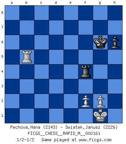 Last move : 1/2-1/2 2025 April 9 20:41:30 [Event "FICGS__CHESS__RAPID_M__000161"] [Site "FICGS"] [Date "2024.11.06"] [Round "1"] [White "Pechova,Hana"] [Black "Swiatek,Janusz"] [Result "1/2-1/2"] [WhiteElo "2143"] [BlackElo "2226"] 1.d4 d5 2.c4 e6 3.Nc3 Bb4 4.cxd5 exd5 5.Bf4 c5 6.dxc5 Nf6 7.e3 O-O 8.Bd3 Bxc3+ 9.bxc3 Nbd7 10.Bd6 Re8 11.Ne2 Qa5 12.a4 Nxc5 13.Bb5 Ncd7 14.O-O a6 15.Bd3 Nc5 16.Bxc5 Qxc5 17.Rb1 Re7 18.Rb4 Bg4 19.Qb3 Bd7 20.h3 Bc6 21.Rd1 Rc7 22.Nf4 h6 23.Be2 b5 24.axb5 Bxb5 25.Bxb5 axb5 26.Nxd5 Nxd5 27.Rxb5 Qxc3 28.Qxd5 Rac8 29.h4 Rc5 30.Rxc5 Rxc5 31.Qa8+ Kh7 32.Qf3 Qf6 33.Qxf6 gxf6 34.Rd4 Kg7 35.Rg4+ Kh7 36.Rf4 f5 37.e4 Rc4 38.Rxf5 Rxe4 39.Rxf7+ Kg6 40.Rb7 Rxh4 41.Rb5 Rd4 42.Ra5 Rf4 43.Rb5 1/2-1/2 Follow this game move after move (download)Combinations have always been the most intriguing aspect of Chess. The masters look for them, the public applauds them, the critics praise them. It is because combinations are possible that Chess is more than a lifeless mathematical exercise. They are the poetry of the game; they are to Chess what melody is to music. They represent the triumph of mind over matter. (Reuben Fine) Sie führen leise Selbstgespräche, schlürfen lautstark ihre Getränke, schmatzen hörbar beim Essen, blasen ihrem Gegenüber Rauch in die Augen, niesen ihm ins Gesicht, starren ihn unverwandt an, bis er sich unter ihren Blicken windet, rutschen ständig auf ihrem Stuhl hin und her, rülpsen und bohren in der Nase. (Anonymous) Tu no necesitas jugar muy bien, únicamente ayudar a tu oponenet a que juegue muy mal. (Genrikh Chepukaitis) Les Echecs mettent en conflit, non pas deux intelligences, mais deux volontés. (Lasker) All politicians must be presumed guilty until they are proven innocent. (Dinesh De Silva)