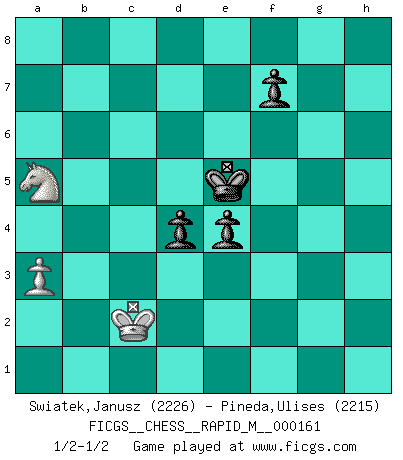 Last move : 1/2-1/2 2025 February 16 23:52:46 [Event "FICGS__CHESS__RAPID_M__000161"] [Site "FICGS"] [Date "2024.11.06"] [Round "1"] [White "Swiatek,Janusz"] [Black "Pineda,Ulises"] [Result "1/2-1/2"] [WhiteElo "2226"] [BlackElo "2215"] 1.e4 c5 2.Nf3 d6 3.d4 cxd4 4.Nxd4 e6 5.Nc3 a6 6.g4 b5 7.Be3 h6 8.a3 Bb7 9.h4 Nd7 10.f3 Be7 11.Bf2 Ngf6 12.Qe2 Rc8 13.Rg1 Nh7 14.O-O-O Bxh4 15.Bxh4 Qxh4 16.f4 Qe7 17.Rg3 g6 18.Nb3 Ndf6 19.Rgd3 O-O 20.Bg2 e5 21.f5 Rfd8 22.Rh1 Kg7 23.Rdh3 Ng8 24.Kb1 Ng5 25.Rh4 Rxc3 26.bxc3 Rc8 27.Qe3 Rc4 28.Nd2 Ra4 29.c4 bxc4 30.Ka2 Bc6 31.Nb1 c3 32.Nxc3 Rc4 33.R4h2 Rc5 34.Bf3 Qc7 35.Ka1 Ba8 36.Na2 Bb7 37.Rxh6 Rxc2 38.R6h2 Qc5 39.Qxc5 Rxc5 40.Rb2 Bxe4 41.Bxe4 Nxe4 42.Re1 Ngf6 43.Rb4 gxf5 44.gxf5 a5 45.Rbxe4 Nxe4 46.Rxe4 Kf6 47.Kb2 Rb5+ 48.Kc2 d5 49.Ra4 Kxf5 50.Nc1 e4 51.Nb3 Ke5 52.Rxa5 Rxa5 53.Nxa5 d4 1/2-1/2 Follow this game move after move (download)No other master has such a terrific will to win. At the board he radiates danger, and even the strongest opponents tend to freeze, like rabbits when they smell a panther. Even his weaknesses are dangerous. As white, his opening game is predictable - you can make plans against it - but so strong that your plans almost never work. In the middle game his precision and invention are fabulous, and in the end game you simply cannot beat him. (Anonymous German Expert) Wenn du nicht weißt was du tun sollst, warte bis dein Gegner eine Idee hat. Sie wird sicher schlecht sein. (Siegbert Tarrasch) Los Peones son nacidos libres, y aún así, se encuentran por doquier encadenados. (Rick Kennedy) Echiquier : carré parfait, comme la Jérusalem nouvelle décrite par l'auteur de l'Apocalypse, huit cases sur huit, exaltation du chiffre 4, symbole du cosmos aux quatre horizons... où le noir et le blanc, l'ombre et la lumière, le mal et le bien s'entremêlent et se conjuguent. (Robert Couffignal, Le Gambit du poète) Drag your thoughts away from your troubles... by the ears, by the heels, or any other way you can manage it. (Mark Twain)