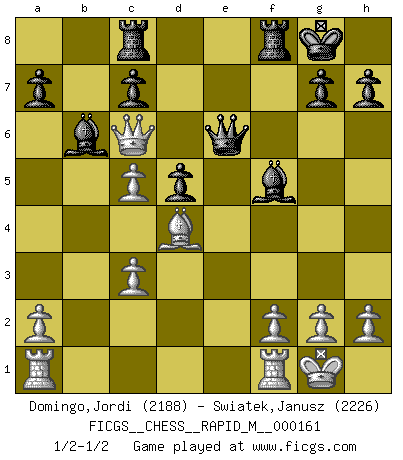 Last move : 1/2-1/2 2025 January 13 11:26:18 [Event "FICGS__CHESS__RAPID_M__000161"] [Site "FICGS"] [Date "2024.11.06"] [Round "1"] [White "Domingo,Jordi"] [Black "Swiatek,Janusz"] [Result "1/2-1/2"] [WhiteElo "2188"] [BlackElo "2226"] 1.e4 e5 2.Nf3 Nc6 3.Bc4 Bc5 4.c3 Nf6 5.d4 exd4 6.e5 d5 7.Bb5 Ne4 8.cxd4 Bb6 9.Nc3 O-O 10.Be3 Bg4 11.Qc2 Nxc3 12.bxc3 f6 13.Bxc6 bxc6 14.exf6 Qxf6 15.Ne5 Bf5 16.Qa4 c5 17.O-O Rac8 18.Qc6 Qd6 19.dxc5 Qxe5 20.Bd4 Qe6 1/2-1/2 Follow this game move after move (download)Help your pieces so they can help you. (Paul Morphy) Schach ist das Spiel, das die Verrückten gesund hält. (Albert Einstein) Las Aperturas te enseñan aperturas. ¡Los Finales te enseñan Ajedrez!. (Stephan Gerzadowicz) Il n'y a pas eu de défaite parce que je ne crois pas que cet ordinateur ait jamais existé. IBM a triché en refusant d'imprimer les modes de recherche de la machine. C'est évident, pendant le match, des coups décisifs ont été joués par des êtres humains. Aujourd'hui, les meilleurs spécialistes en informatique ne peuvent toujours pas expliquer comment Deep-Blue a pu jouer contre la logique des ordinateurs. IBM a gagné une guerre de communication, mais ils sont incapables de prouver que l'ordinateur a gagné tout seul. (Garry Kasparov) The greatest con, that he ever pulled... was making you believe... that he is you. (Revolver, movie)