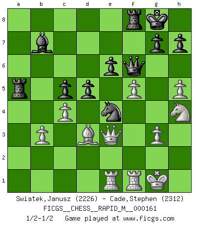 Last move : 1/2-1/2 2025 January 14 10:57:18 [Event "FICGS__CHESS__RAPID_M__000161"] [Site "FICGS"] [Date "2024.11.06"] [Round "1"] [White "Swiatek,Janusz"] [Black "Cade,Stephen"] [Result "1/2-1/2"] [WhiteElo "2226"] [BlackElo "2312"] 1.e4 c6 2.d4 d5 3.e5 c5 4.Nf3 cxd4 5.Nxd4 Nc6 6.Nxc6 bxc6 7.Bd3 e6 8.O-O Ne7 9.Nd2 a5 10.Qe2 Ng6 11.g3 Be7 12.h4 f6 13.exf6 Bxf6 14.Nf3 O-O 15.h5 Nh8 16.Bf4 Nf7 17.Be5 c5 18.b3 a4 19.Rae1 Ra5 20.Qd2 Ra8 21.Qe3 axb3 22.axb3 Ra5 23.c4 Bb7 24.Bxf6 Qxf6 25.Nh4 Ng5 26.f4 Ne4 27.f5 1/2-1/2 Follow this game move after move (download)My style is somewhere between that of Tal and Petrosian. (Reshevsky) Alle Schachspieler sollten auch ein Hobby haben. (Savielly Grigorievitsch Tartakower) Solo el jugador con la iniciativa tiene el derecho a atacar. (Wilhelm Steinitz) Si je n'étais pas joueur d'échecs, je serais le meilleur dans quelque chose d'autre. (Anatoli Karpov) I find your interest interesting. (Gregory House, House M.D.)