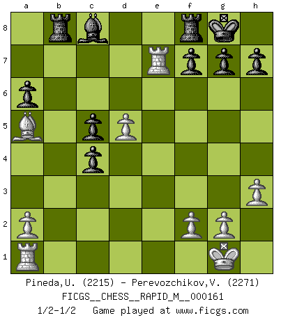 Last move : 1/2-1/2 2024 November 23 14:56:7 [Event "FICGS__CHESS__RAPID_M__000161"] [Site "FICGS"] [Date "2024.11.06"] [Round "1"] [White "Pineda,Ulises"] [Black "Perevozchikov,Vjacheslav"] [Result "1/2-1/2"] [WhiteElo "2215"] [BlackElo "2271"] 1.c4 e6 2.Nc3 d5 3.d4 dxc4 4.e4 c5 5.d5 Nf6 6.Bxc4 exd5 7.exd5 a6 8.Nf3 Bd6 9.Qe2+ Qe7 10.O-O Qxe2 11.Bxe2 O-O 12.Nd2 Be5 13.Nc4 Bxc3 14.bxc3 Nbd7 15.Ne3 Ne4 16.c4 b5 17.Re1 Nd6 18.Bd2 Nb6 19.Ba5 Nbxc4 20.Nxc4 Nxc4 21.Bxc4 bxc4 22.Re7 Rb8 23.h3 1/2-1/2 Follow this game move after move (download)Chess is imagination. (David Bronstein) Am wohlsten fühle ich mich, wenn ich sehe, wie sich mein Gegner im Todeskampf windet. (Robert James Fischer) Uno por uno, yo los acribillé, mi superioridad muy pronto se volvio aparente. (Jose Capablanca) Avant la finale, les dieux ont créé le milieu de partie. (Tarrasch) No, no, you're not thinking; you're just being logical. (Niels Bohr)