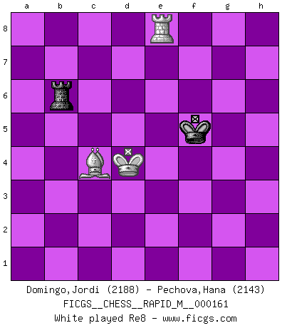 Last move : 1-0 2025 June 18 10:55:7 [Event "FICGS__CHESS__RAPID_M__000161"] [Site "FICGS"] [Date "2024.11.06"] [Round "1"] [White "Domingo,Jordi"] [Black "Pechova,Hana"] [Result "1-0"] [WhiteElo "2188"] [BlackElo "2143"] 1.e4 d5 2.exd5 Qxd5 3.Nc3 Qa5 4.d4 Nf6 5.Nf3 Bf5 6.Ne5 c6 7.Bc4 e6 8.g4 Bg6 9.h4 Nbd7 10.Nxd7 Nxd7 11.h5 Be4 12.O-O Bd5 13.Nxd5 cxd5 14.Bd3 Bd6 15.a4 Qd8 16.Kg2 a6 17.c3 g5 18.b3 Qf6 19.Be3 h6 20.Qd2 Qg7 21.c4 O-O 22.cxd5 exd5 23.Qa5 Nf6 24.Bf5 Rab8 25.Rfc1 Rfe8 26.b4 Bf4 27.Ra3 Re7 28.Qc5 Rbe8 29.Re1 Qf8 30.Bxf4 Rxe1 31.Bd6 Qg7 32.Be5 R8xe5 33.dxe5 Rxe5 34.Qc7 Ne8 35.Qxb7 Qf8 36.Rc3 Nd6 37.Qd7 Nc4 38.Qc8 Qxc8 39.Bxc8 Nb6 40.Bf5 Nxa4 41.Ra3 Nb6 42.Rxa6 Nc4 43.Rxh6 Re2 44.Kg3 Rb2 45.Rc6 Rb3+ 46.Kg2 Rxb4 47.h6 Rb8 48.Kg3 Nd2 49.f3 Rd8 50.Bc2 Nc4 51.Rc7 Ne5 52.f4 gxf4+ 53.Kxf4 Ng6+ 54.Kf5 d4 55.Bb3 Nh8 56.g5 d3 57.g6 d2 58.g7 Kh7 59.gxh8Q+ Kxh8 60.Bd1 Rd5+ 61.Ke4 Rd6 62.Rxf7 Re6+ 63.Kd3 Rxh6 64.Kxd2 Rh7 65.Rf4 Rd7+ 66.Ke2 Kg7 67.Bb3 Rd6 68.Ke3 Rf6 69.Re4 Rb6 70.Bc4 Kg6 71.Kd4 Kf5 72.Re8 Kf6 73.Kc5 Rb1 74.Bd5 Ra1 75.Kd6 1-0 This chess game has been lost on time (started : 2024.11.06 11:42:36) Follow this game move after move (download)It is not enough to be a good player... you must also play well. (Siegbert Tarrasch) Wenn Dein Gegner dir ein Remis anbietet, versuch herauszufinden, weshalb er glaubt schlechter zu stehen. (Nigel Short) El Ajedrez es tan inspirador que yo no creo que un buen jugador sea capaz de tener un pensamiento malo durante una partida. (Wilhelm Steinitz) Ce qui est bien, c'est d'avoir tout un tas de pièces en prise : l'adversaire ne peut en prendre qu'une à la fois. Cité par Thierry Audin. If you have any trouble condescending, find a Unix user to show you how it's done. (Scott Adams)