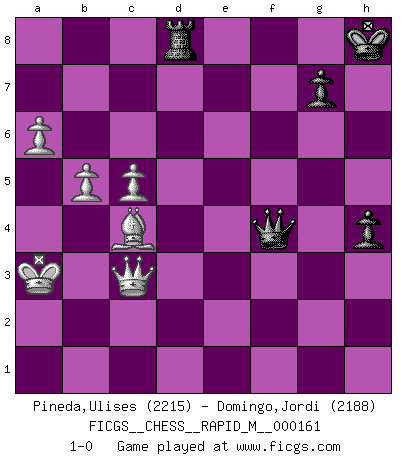 Last move : 1-0 2025 February 6 17:44:20 [Event "FICGS__CHESS__RAPID_M__000161"] [Site "FICGS"] [Date "2024.11.06"] [Round "1"] [White "Pineda,Ulises"] [Black "Domingo,Jordi"] [Result "1-0"] [WhiteElo "2215"] [BlackElo "2188"] 1.e4 e5 2.Nf3 d6 3.d4 exd4 4.Nxd4 Nf6 5.Nc3 Be7 6.Bf4 O-O 7.Qd2 d5 8.Ndb5 Bb4 9.O-O-O Ba5 10.exd5 a6 11.Nd4 Bxc3 12.Qxc3 Nxd5 13.Qd2 Nxf4 14.Qxf4 Qd5 15.a3 Nc6 16.Nb5 Qa2 17.Nxc7 Rb8 18.c3 Na5 19.Bd3 Be6 20.Nxe6 fxe6 21.Qh4 h6 22.Rhe1 b5 23.Qe4 Nb3+ 24.Kc2 Rxf2+ 25.Re2 Rxe2+ 26.Bxe2 Na1+ 27.Rxa1 Qxa1 28.Qxe6+ Kh8 29.Qxa6 Qe1 30.Qe6 Qf2 31.Qe5 Rd8 32.Kb1 Qxg2 33.Bxb5 Rd2 34.Ka1 Qf3 35.Ka2 Qf7+ 36.c4 Qf1 37.a4 Rd1 38.Kb3 Qd3+ 39.Qc3 Qe4 40.c5 Qe6+ 41.Bc4 Qe4 42.h4 Rd8 43.Ka3 Qxh4 44.a5 Qf4 45.a6 h5 46.b4 h4 47.b5 1-0 Follow this game move after move (download)Examine moves that smite! A good eye for smites is far more important than a knowledge of strategical principles. (Purdy) Ich bin es gewohnt, das die Jugend mir überhaupt keinen Respekt entgegenbringt. (Alexander Morozewich) Una compensación adecuada por un sacrificio es tener una combinación sólida que conduce a una posición ganadora; una compensación adecuada por una metida de pata es dejar a tu oponente arrebatar una derrota de las fauces de la victoria. (Bruce A. Moon) Les échecs, c'est l'art d'analyser. (Mikhail Botvinnik) Life is like a play: it's not the length but the excellence of the acting that matters. (Seneca)