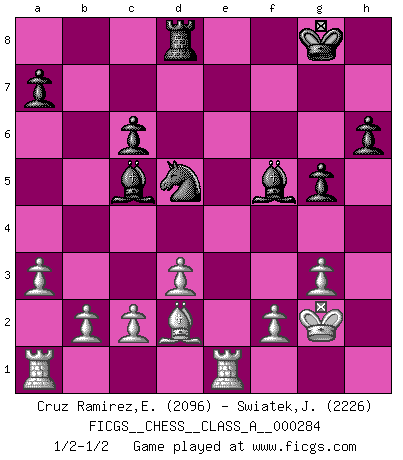 Last move : 1/2-1/2 2025 January 24 4:12:36 [Event "FICGS__CHESS__CLASS_A__000284"] [Site "FICGS"] [Date "2024.11.11"] [Round "1"] [White "Cruz Ramirez,Eliecer"] [Black "Swiatek,Janusz"] [Result "1/2-1/2"] [WhiteElo "2096"] [BlackElo "2226"] 1.e4 e5 2.Nf3 Nc6 3.Bc4 Nf6 4.Ng5 d5 5.exd5 Na5 6.Bb5+ c6 7.dxc6 bxc6 8.Bd3 Nd5 9.Nf3 Bd6 10.O-O O-O 11.Re1 f5 12.Nxe5 Qf6 13.Nf3 g5 14.g3 f4 15.Nc3 fxg3 16.hxg3 Qxf3 17.Qxf3 Rxf3 18.Be4 Rf5 19.Bxf5 Bxf5 20.Ne4 Bf8 21.d3 h6 22.Bd2 Nb7 23.a3 Rd8 24.Kg2 Nc5 25.Nxc5 Bxc5 1/2-1/2 Follow this game move after move (download)Fischer is under obligation to nobody. (Joseph Platz) Je älter ich werde, um so mehr schätze ich die Bauern. (Paul Keres) El poder defensivo de una pieza clavada, solamente es imaginario. (Aaron Nimzovich) Les ravages du H expliquent la différence de niveau entre Tal et Thal [Abergel]. We're missing something. (Gregory House, House M.D.)