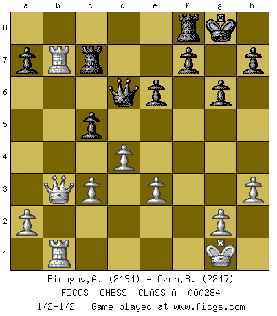Last move : 1/2-1/2 2025 January 10 15:5:5 [Event "FICGS__CHESS__CLASS_A__000284"] [Site "FICGS"] [Date "2024.11.11"] [Round "1"] [White "Pirogov,Andrey Mikhaylovich"] [Black "Ozen,Bahadir"] [Result "1/2-1/2"] [WhiteElo "2194"] [BlackElo "2247"] 1.Nf3 d5 2.d4 Nf6 3.e3 c5 4.Be2 Nc6 5.O-O Bg4 6.h3 Bxf3 7.Bxf3 cxd4 8.exd4 e6 9.Be3 Bd6 10.c4 dxc4 11.Bxc6+ bxc6 12.Nd2 c3 13.bxc3 Nd5 14.Ne4 Nxe3 15.Nxd6+ Qxd6 16.fxe3 O-O 17.Rb1 Rac8 18.Rb7 Rc7 19.Qb3 g6 20.Rb1 c5 1/2-1/2 Follow this game move after move (download)Chess is a fighting game which is purely intellectual and includes chance. (Richard Reti) Im Leben werden Partien nie so unstrittig gewonnen wie im Spiel (Emanuel Lasker) Los tropiezos estan todos ahí en el tablero, esperando que se cometan. (Savielly Tartakover) Le système Elo représente seulement une moyenne. Il est simplement un indicateur de votre stabilité. (Anatoli Karpov) Now the reason the enlightened prince and the wise general conquer the enemy whenever they move and their achievements surpass those of ordinary men is foreknowledge. (Sun Tzu)