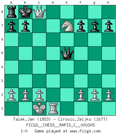 Last move : 1-0 2025 January 12 21:54:3 [Event "FICGS__CHESS__RAPID_C__000305"] [Site "FICGS"] [Date "2024.11.18"] [Round "1"] [White "Talek,Jan"] [Black "Cirovic,Zeljko"] [Result "1-0"] [WhiteElo "1853"] [BlackElo "1677"] 1.e4 c5 2.Nf3 e6 3.d4 cxd4 4.Nxd4 Nc6 5.Nc3 Nxd4 6.Qxd4 d6 7.Bf4 e5 8.Bxe5 dxe5 9.Bb5+ Bd7 10.Qxe5+ Qe7 11.Bxd7+ Kxd7 12.O-O-O Kc8 13.Qg3 Nf6 14.Rd3 Qc7 15.e5 Nd7 16.Qh3 Be7 17.Rhd1 Rd8 18.Nd5 Qxe5 19.Nxe7+ Kc7 20.Rxd7+ Rxd7 21.Qxd7+ Kb8 22.Qc8+ 1-0 Follow this game move after move (download)My opponents make good moves too. Sometimes I don't take these things into consideration. (Bobby Fischer) Wie gewinnt Tal? Er entwickelt alle seine Figuren in die Brettmitte und opfert sie dann irgendwo. (Robert James Fischer) Un sacrificio se refuta mucho mejor al aceptarlo. (Wilhelm Steinitz) Le jeu d'échecs fait naître et fortifie en nous plusieurs qualités précieuses dans le cours de l'existence, telles que la prévoyance, la circonspection, la prudence, et la persévérance. (Benjamin Franklin - 1783, la morale des échecs) In every real man a child is hidden that wants to play. (Friedrich Nietzsche)