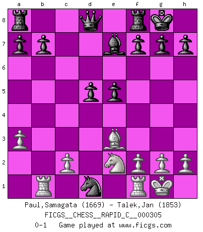 Last move : 0-1 2024 December 9 2:30:21 [Event "FICGS__CHESS__RAPID_C__000305"] [Site "FICGS"] [Date "2024.11.18"] [Round "1"] [White "Paul,Samagata"] [Black "Talek,Jan"] [Result "0-1"] [WhiteElo "1669"] [BlackElo "1853"] 1.d4 e6 2.e4 d5 3.e5 c5 4.Nf3 cxd4 5.Qxd4 Nc6 6.Qd1 Nge7 7.Nc3 Ng6 8.Bb5 Bd7 9.a3 Ncxe5 10.Nxe5 Nxe5 11.Bxd7+ Nxd7 12.O-O Be7 13.Be3 O-O 14.Rc1 Ne5 15.Ne2 Nc4 16.Bd4 e5 17.Be3 Nxb2 18.Rb1 Nxd1 0-1 Follow this game move after move (download)A passed Pawn increases in strength as the number of pieces on the board diminishes. (Capablanca) Kasparov ist eine Art Monster mit hundert Augen, denen auch nicht das Geringste entgeht. (Tony Miles) Botvinnik trataba de restarle el misterio al Ajedrez, siempre relacionandolo a situaciones de la vida ordinaria. El gustaba de llamar al Ajedrez un típico problema inexacto similar a aquellos de los cuales la gente siempre tiene que enfrentarse en la vida cotidiana. (Garry Kasparov) L'action d'une oeuvre littéraire se déroule sur un champ de bataille. Les masques et les types du drame moderne correspondent aux pièces du jeu d'échecs. L'intrigue correspond aux coups et aux gambits, c'est à dire aux techniques du jeu telles qu'utilisées et interprétées par les joueurs. Les tactiques et les péripéties [mouvements] correspondent aux coups exécutés par l'adversaire. (Viktor Shklovsky) Unless in communicating with it one says exactly what one means, trouble is bound to result. (Alan Turing, about computers)