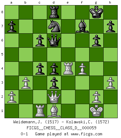 Last move : 0-1 2008 February 28 2:44:35 [Event "FICGS__CHESS__CLASS_D__000059"] [Site "FICGS"] [Date "2007.09.21"] [Round "1"] [White "Weidemann,Jaap"] [Black "Kolawski,Christof"] [Result "0-1"] [WhiteElo "1517"] [BlackElo "1572"] 1.Nf3 Nf6 2.d4 g6 3.c4 Bg7 4.Nc3 O-O 5.e4 d6 6.Be2 e5 7.O-O Nbd7 8.Be3 c6 9.Qc2 Ng4 10.Bg5 f6 11.Bd2 f5 12.exf5 exd4 13.Ne4 Rxf5 14.h3 Rxf3 15.Bxf3 Nge5 16.Be2 Nc5 17.Nxc5 dxc5 18.Qc1 d3 19.Bd1 Qd6 20.Bc3 Be6 21.b3 b5 22.Qd2 Bf7 23.Re1 Bf6 24.f4 Nd7 25.Rc1 Rd8 26.Re3 Bd4 27.Bxd4 cxd4 28.Re4 bxc4 0-1 Reti Opening Kingside Castling by player Black (move 4) Kingside Castling by player White (move 7) Player Black won this chess game. Follow this game move after move (download)Strategy requires thought, tactics require observation. (Max Euwe) Immer nach dem besten Zug zu suchen ist ziemlich unpraktisch. (Nigel Short) Un buen sacrificio es aquel que aunque no sea necesariamente sólido, deja a tu oponente aturdido y confuso. (Rudolph Spielmann) Seul un grand joueur sait à quel point il joue faiblement. (Xavier Tartacover) To be champion requires more than simply being a strong player; one has to be a strong human being as well. (Anatoly Karpov)