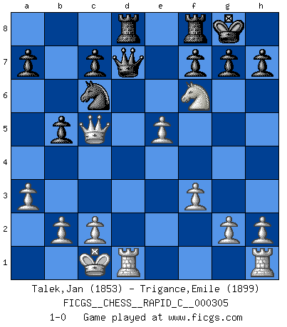 Last move : 1-0 2025 January 25 7:58:44 [Event "FICGS__CHESS__RAPID_C__000305"] [Site "FICGS"] [Date "2024.11.18"] [Round "1"] [White "Talek,Jan"] [Black "Trigance,Emile"] [Result "1-0"] [WhiteElo "1853"] [BlackElo "1899"] 1.f3 e5 2.Nc3 d5 3.d4 exd4 4.Qxd4 Nf6 5.e4 Nc6 6.Bb5 Bd7 7.Bxc6 Bxc6 8.e5 Ng8 9.Bf4 b6 10.Nge2 Bc5 11.Qd3 Qd7 12.O-O-O Ne7 13.a3 b5 14.Be3 Bxe3+ 15.Qxe3 O-O 16.Qc5 Qe6 17.Nd4 Qd7 18.Nxc6 Nxc6 19.Nxd5 Rad8 20.Nf6+ 1-0 Follow this game move after move (download)Man is a frivolous, a specious creature, and like a Chess player, cares more for the process of attaining his goal than for the goal itself. (Dostoyevsky) Es ist schade, dass viele Schachsportler vergessen, wie wichtig Auftreten und angemessene Kleidung sind. (Alexandra Kosteniuk) El Ajedrez es el arte del análisis. (Mikhail Botvinnik) A ce moment-là, je menaçais de comprendre la position ! (Clément L'Heureux) Happy endings are just stories that haven't finished yet. (Jane Smith in Mr & Mrs Smith)