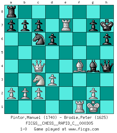 Last move : 1-0 2025 January 15 12:39:40 [Event "FICGS__CHESS__RAPID_C__000305"] [Site "FICGS"] [Date "2024.11.18"] [Round "1"] [White "Pintor,Manuel"] [Black "Brodie,Peter"] [Result "1-0"] [WhiteElo "1740"] [BlackElo "1625"] 1.e4 e5 2.f4 exf4 3.Nf3 Nc6 4.Bc4 h6 5.h4 Nf6 6.d3 Bd6 7.O-O O-O 8.Nc3 Nh5 9.e5 Bxe5 10.Nxe5 Nxe5 11.Bxf7+ Rxf7 12.Qxh5 d6 13.Qe2 Bg4 14.Qe4 Qxh4 15.Bxf4 Nc6 16.Rae1 Re7 17.Qc4+ Kh7 18.Rxe7 1-0 Follow this game move after move (download)I won't play with you anymore. You have insulted my friend. - When an opponent cursed himself for a blunder. (Miguel Najdorf) Ich organisiere ein großes Turnier, was mich etwa 120000 Dollar kostet. Ich denke, das ist das erste Mal in der Schachgeschichte, daß ein Schachgroßmeister auch als Mäzen auftritt. (Miguel Najdorf) Una compensación adecuada por un sacrificio es tener una combinación sólida que conduce a una posición ganadora; una compensación adecuada por una metida de pata es dejar a tu oponente arrebatar una derrota de las fauces de la victoria. (Bruce A. Moon) Echiquier : carré parfait, comme la Jérusalem nouvelle décrite par l'auteur de l'Apocalypse, huit cases sur huit, exaltation du chiffre 4, symbole du cosmos aux quatre horizons... où le noir et le blanc, l'ombre et la lumière, le mal et le bien s'entremêlent et se conjuguent. (Robert Couffignal, Le Gambit du poète) Pushing plastic is for the many, pushing virtual pieces is for the fewer, pushing wood is for the very few. (Normajean Yates)