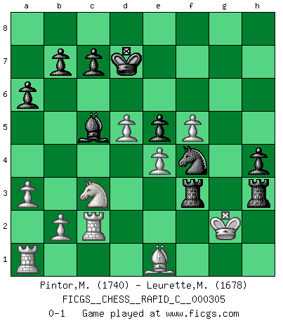 Last move : 0-1 2024 December 19 8:55:30 [Event "FICGS__CHESS__RAPID_C__000305"] [Site "FICGS"] [Date "2024.11.18"] [Round "1"] [White "Pintor,Manuel"] [Black "Leurette,Marc-Antoine"] [Result "0-1"] [WhiteElo "1740"] [BlackElo "1678"] 1.e4 e5 2.f4 d6 3.Nf3 Nc6 4.Bc4 exf4 5.O-O Be6 6.Bxe6 fxe6 7.d4 e5 8.d5 Nce7 9.c4 g5 10.Nxg5 Qd7 11.Qh5+ Ng6 12.Ne6 Nf6 13.Qh3 Be7 14.Nc3 Rg8 15.Nb5 Bd8 16.Nc3 Nf8 17.Kh1 Kf7 18.g3 Nxe6 19.dxe6+ Qxe6 20.Qxe6+ Kxe6 21.gxf4 Be7 22.Nb5 Kd7 23.Nc3 a6 24.f5 h5 25.h3 Rg3 26.Kh2 Rag8 27.Rf2 h4 28.a3 Nh7 29.Nd5 Nf6 30.Nc3 d5 31.cxd5 Bc5 32.Re2 Rf3 33.Bd2 R8g3 34.Be1 Rxh3+ 35.Kg2 Nh5 36.Rc2 Nf4+ 0-1 Follow this game move after move (download)The essence of Chess is thinking about what Chess is. (David Bronstein) Die Neutralität betrachte ich als eine schwere Krankheit. (Viktor Kortschnoi) Es muy difícil jugar en contra de la teoría de Einstein. - en su primera derrota en contra de Fischer (Mikhail Tal) Les réformistes prétendent que les progrès de la théorie conduiront à la disparition des échecs, et qu'il faut, pour leur rendre vie, en remanier les règles. En réalité, qu'exprime cette affirmation? Le mépris de l'intuition, de l'imagination et de tous les autres éléments qui font des échecs un art. (Alexander Alekhine) There will be no order, only chaos. (Sol Robeson in Pi by Darren Aronofsky)