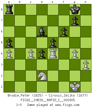Last move : 1-0 2025 March 7 20:31:53 [Event "FICGS__CHESS__RAPID_C__000305"] [Site "FICGS"] [Date "2024.11.18"] [Round "1"] [White "Brodie,Peter"] [Black "Cirovic,Zeljko"] [Result "1-0"] [WhiteElo "1625"] [BlackElo "1677"] 1.Nf3 c5 2.c4 Nc6 3.Nc3 e6 4.e3 Nf6 5.Be2 d5 6.d3 dxc4 7.dxc4 Be7 8.O-O Qxd1 9.Rxd1 O-O 10.h3 a6 11.a3 Rd8 12.Rxd8+ Bxd8 13.Bd2 Bc7 14.Rd1 b6 15.e4 Nd4 16.Nxd4 cxd4 17.Nb1 Nxe4 18.Bd3 Nxd2 19.Nxd2 e5 20.Re1 f6 21.g4 h5 22.f3 hxg4 23.fxg4 Bb7 24.Be4 Bxe4 25.Rxe4 Bd6 26.b4 a5 27.bxa5 bxa5 28.a4 1-0 Follow this game move after move (download)Pawns: they are the soul of this game, they alone form the attack and defense. (Philidor) Immer nach dem besten Zug zu suchen ist ziemlich unpraktisch. (Nigel Short) El Ajedrez, como cualquier actividad creativa, solo puede existir a través del esfuerzo combinado de aquellos que tienen talento creativo y de aquellos que poseen la habilidad de organizar su trabajo creativo. (Mikhail Botvinnik) Le profane ne songe pas à la somme de jouissance dont il se prive, qui méconnaît ce jeu aux ressources aussi variées que passionnantes. (Jean-Marie Jeanton-Lamarche) I'll be back. (Arnold Schwarzenegger)