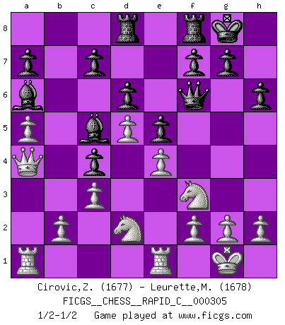 Last move : 1/2-1/2 2024 December 31 13:53:14 [Event "FICGS__CHESS__RAPID_C__000305"] [Site "FICGS"] [Date "2024.11.18"] [Round "1"] [White "Cirovic,Zeljko"] [Black "Leurette,Marc-Antoine"] [Result "1/2-1/2"] [WhiteElo "1677"] [BlackElo "1678"] 1.e4 e5 2.Nf3 Nc6 3.Bb5 Nf6 4.d3 Bc5 5.Bxc6 bxc6 6.c3 d6 7.Bg5 h6 8.Bxf6 Qxf6 9.Nbd2 O-O 10.Nb3 Bb6 11.O-O Ba6 12.Re1 Rad8 13.d4 c5 14.d5 c4 15.Nbd2 Bb5 16.a4 Ba6 17.a5 Bc5 18.Qa4 1/2-1/2 Follow this game move after move (download)Good positions don't win games, good moves do. (Gerald Abrahams) Im Wettkampf zwischen starken Meistern kommen Fehler sehr selten vor, deshalb ist es mit bloßem Warten nicht getan. (José Raúl Capablanca) No volvere nunca a jugar contigo. Has insultado a mi amigo. - cuando un oponente se maldijo por una mala jugada (Miguel Najdorf) À la honte des hommes, on sait que les lois du jeu sont les seules qui soient partout justes, claires, inviolables et exécutées. Pourquoi l'Indien qui a donné les règles du jeu d'échecs est-il obéi de bon gré dans toute la terre, et que les décrétales des papes, par exemple, sont aujourd'hui un objet d'horreur et de mépris ? C'est que l'inventeur des échecs combina tout avec justesse pour la satisfaction des joueurs, et que les papes, dans leurs décrétales, n'eurent en vue que leur seul avantage. L'Indien voulut exercer également l'esprit des hommes et leur donner du plaisir; les papes ont voulu abrutir l'esprit des hommes. Voltaire (Dictionnaire philosophique / Garnier 1967) All the troubles of the world come from being unable to sit alone in a quiet room. (Blaise Pascal)