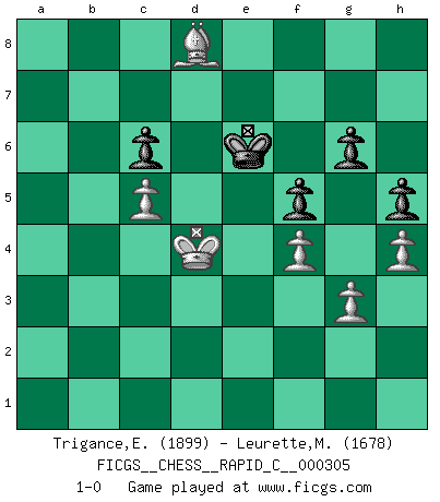 Last move : 1-0 2025 January 21 14:45:3 [Event "FICGS__CHESS__RAPID_C__000305"] [Site "FICGS"] [Date "2024.11.18"] [Round "1"] [White "Trigance,Emile"] [Black "Leurette,Marc-Antoine"] [Result "1-0"] [WhiteElo "1899"] [BlackElo "1678"] 1.e4 e5 2.Nf3 Nc6 3.d4 exd4 4.Nxd4 Nf6 5.Nxc6 bxc6 6.e5 Qe7 7.Qe2 Nd5 8.c4 Nb6 9.Nd2 g6 10.b3 Bg7 11.Nf3 O-O 12.g3 d6 13.Bb2 Re8 14.O-O-O d5 15.Qc2 a5 16.Nd4 Bb7 17.Nf3 dxc4 18.Bxc4 Nxc4 19.Qxc4 c5 20.Qc3 Bxe5 21.Nxe5 Qxe5 22.Qxe5 Rxe5 23.Bxe5 Bxh1 24.Rxh1 c6 25.Bd6 a4 26.Be5 axb3 27.axb3 Kf8 28.Kb2 Ke7 29.Rd1 Ke6 30.f4 f6 31.Bc7 f5 32.Bb6 c4 33.bxc4 Ra4 34.Kb3 Ra8 35.c5 Re8 36.Re1+ Kd7 37.Rxe8 Kxe8 38.Kc4 Kd7 39.Kd4 Ke6 40.h4 h5 41.Bd8 1-0 Follow this game move after move (download)To avoid losing a piece, many a person has lost the game. (Savielly Tartakover) Später, ... hatte ich zunehmend Erfolg in entscheidenden Partien. Vielleicht weil ich eine einfache Wahrheit erkannte: nicht nur ich hatte Angst, auch mein Gegner. (Mikhail Nekhemyevich Tal) Tu puedes aprender mucho mas de una partida que pierdas que de una partida ganada. Tendras que perder cientos de partidas antes de llegar a ser un buen jugador. (Jose Raul Capablanca) Si le désir cupide (et stupide) de gagner est une inépuisable source de souffrance, une combinaison brillante sur l'échiquier est une découverte : le coquelicot qui s'épanouit lorsque apparaît la Voie Lactée. (Arrabal) Luck never gives; it only lends. (Swedish proverb)
