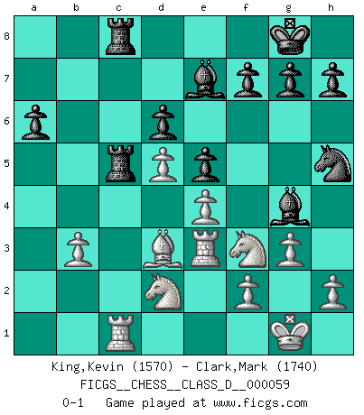 Last move : 0-1 2008 February 22 14:1:48 [Event "FICGS__CHESS__CLASS_D__000059"] [Site "FICGS"] [Date "2007.09.21"] [Round "1"] [White "King,Kevin"] [Black "Clark,Mark"] [Result "0-1"] [WhiteElo "1570"] [BlackElo "1740"] 1.e4 Nc6 2.Nf3 e5 3.Bb5 a6 4.Ba4 Nf6 5.d3 b5 6.Bb3 Be7 7.c3 d6 8.O-O O-O 9.Nbd2 Na5 10.Bc2 c5 11.d4 Qc7 12.Re1 Bg4 13.d5 b4 14.cxb4 cxb4 15.Bd3 Rfc8 16.Qe2 Nh5 17.g3 Qb6 18.b3 Rc7 19.Qe3 Qxe3 20.Rxe3 Nb7 21.a3 bxa3 22.Bxa3 Nc5 23.Rc1 Rac8 24.Bxc5 Rxc5 0-1 KP : Nimzovich defense Kingside Castling by player White (move 8) Kingside Castling by player Black (move 8) Player Black won this chess game. Follow this game move after move (download)It began to feel as though you were playing against Chess itself. - On playing against Robert Fischer. (Walter Shipman) Ein typischer, sehr verbreiteter Gedankenschädling ist der, daß der betreffende Amateur von der Annanhme ausgeht, daß jeder einzelne Zug etwas zu leisten habe. (Aaron Nimzowitsch) El ganador de una partida es aquel jugador que hace el penúltimo error. (Savielly Tartakover) L'ordinateur a tué l'originalité. Il n'y a plus guère d'aventures sur l'échiquier. (Jacob Murray) Philosophers use a language that is already deformed as though by shoes that are too tight. (Ludwig Wittgenstein)