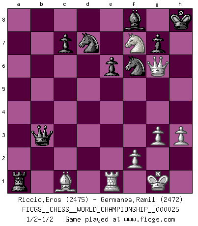Last move : 1/2-1/2 2025 March 6 18:20:23 [Event "FICGS__CHESS__WORLD_CHAMPIONSHIP__000025"] [Site "FICGS"] [Date "2024.11.19"] [Round "5"] [White "Riccio,Eros"] [Black "Germanes,Ramil"] [Result "1/2-1/2"] [WhiteElo "2475"] [BlackElo "2472"] 1.e4 e5 2.Nf3 Nc6 3.Bb5 a6 4.Ba4 Nf6 5.O-O Be7 6.Re1 b5 7.Bb3 O-O 8.c3 d6 9.h3 Nb8 10.d4 Nbd7 11.Nbd2 Bb7 12.Bc2 Re8 13.a4 Bf8 14.Bd3 h6 15.axb5 exd4 16.cxd4 axb5 17.Rxa8 Qxa8 18.e5 dxe5 19.dxe5 Nd5 20.Bxb5 N5b6 21.Re3 Bc6 22.Bxc6 Qxc6 23.e6 fxe6 24.Ne4 Nd5 25.Re1 Qc4 26.b3 Qc6 27.Qe2 Ra8 28.Nd4 Qb6 29.Qg4 Ra6 30.Nf3 Ra1 31.g3 Kh8 32.Qg6 Qxb3 33.Neg5 hxg5 34.Nxg5 N5f6 35.Nf7+ Kg8 36.Nh6+ Kh8 37.Nf7+ Kg8 38.Nh6+ Kh8 39.Nf7+ 1/2-1/2 Follow this game move after move (download)All Chess players should have a hobby. (Savielly Tartakower) Gegen einen Schachcomputer zu verlieren ist wie Löcher in den Strümpfen zuhaben. Es ist nicht peinlich, solange man der einzige ist der es weiß. (Anonymous) Diferente gente reacciona diferentemente en aceptar la derrota. (Bobby Fischer) Les erreurs sont comme les malheurs, elles n'arrivent jamais seules. (Siegbert Tarrasch) I know the human being and fish can coexist peacefully. (George W. Bush, Saginaw sept. 29, 2000)