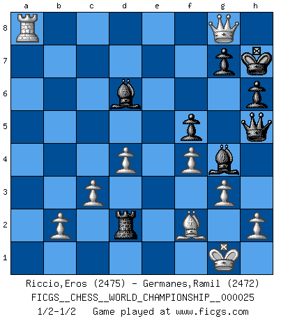 Last move : 1/2-1/2 2025 February 22 6:35:33 [Event "FICGS__CHESS__WORLD_CHAMPIONSHIP__000025"] [Site "FICGS"] [Date "2024.11.19"] [Round "7"] [White "Riccio,Eros"] [Black "Germanes,Ramil"] [Result "1/2-1/2"] [WhiteElo "2475"] [BlackElo "2472"] 1.e4 e5 2.Nf3 Nc6 3.Bb5 a6 4.Ba4 Nf6 5.O-O Be7 6.Re1 b5 7.Bb3 O-O 8.c3 d5 9.exd5 Nxd5 10.Nxe5 Nxe5 11.Rxe5 c6 12.Re1 Bd6 13.d4 Qh4 14.g3 Qh3 15.Be3 Bg4 16.Qd3 f5 17.f4 Kh8 18.Bxd5 cxd5 19.Nd2 Rfe8 20.Qf1 Qh5 21.a4 bxa4 22.Rxa4 a5 23.R4a1 h6 24.Qg2 Re7 25.Bf2 Rae8 26.Rxe7 Rxe7 27.Rxa5 Re2 28.Qxd5 Rxd2 29.Ra8+ Kh7 30.Qg8+ Kg6 31.Qe6+ Kh7 32.Qg8+ Kg6 33.Qe6+ Kh7 34.Qg8+ 1/2-1/2 Follow this game move after move (download)In a gambit you give up a Pawn for the sake of getting a lost game. (Samuel Standige Boden) Wenn du auf das Glück wartest, wird das Leben ziemlich langweilig. (Mikhail Nekhemyevich Tal) De eso se trata el Ajedrez. Un día le das una lección a tu oponente y al día siguiente el te da una a tí. (Bobby Fischer) Des points faibles ou des trous dans la position de l'adversaire doivent être occupés par des pièces et non pas par des pions. (Siegbert Tarrasch) Life is like a game of cards: the hand you are dealt represents determinism; the way you play it is free will. (Jawaharlal Nehru)