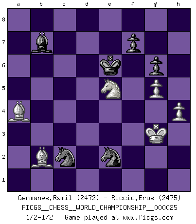Last move : 1/2-1/2 2025 March 25 0:30:36 [Event "FICGS__CHESS__WORLD_CHAMPIONSHIP__000025"] [Site "FICGS"] [Date "2024.11.19"] [Round "8"] [White "Germanes,Ramil"] [Black "Riccio,Eros"] [Result "1/2-1/2"] [WhiteElo "2472"] [BlackElo "2475"] 1.d4 d5 2.c4 dxc4 3.Nf3 Nf6 4.e3 e6 5.Bxc4 c5 6.O-O a6 7.b3 Nbd7 8.Bb2 Be7 9.dxc5 Bxc5 10.Nbd2 b6 11.Qe2 Bb7 12.Bd3 O-O 13.a3 b5 14.b4 Be7 15.e4 Rc8 16.h3 Qc7 17.e5 Nd5 18.Qe4 g6 19.Rfc1 Qb8 20.Qg4 Rxc1+ 21.Rxc1 Rc8 22.Re1 Qc7 23.Ng5 a5 24.Qh4 Bxg5 25.Qxg5 axb4 26.axb4 Qd8 27.Qxd8+ Rxd8 28.Bxb5 Nxb4 29.Rd1 Nb6 30.Ba3 Nc6 31.Bc5 Nd7 32.Be3 Ndxe5 33.f4 Nd3 34.Ne4 Ndb4 35.Rxd8+ Nxd8 36.Nf6+ Kg7 37.Bd4 Ndc6 38.Bc3 Na2 39.Bb2 Nab4 40.g4 h6 41.g5 hxg5 42.fxg5 Nc2 43.Kf2 Kf8 44.h4 Ke7 45.Ba4 N6d4 46.Ng4 e5 47.Nxe5 Ke6 48.Kg3 Ne2+ 1/2-1/2 Follow this game move after move (download)Some part of a mistake is always correct. (Savielly Tartakover) Schach ist Krieg, im Schach geht es um testosterongesteuerte Urschreie. (Garry Kasparov) Del Ajedrez se ha dicho que la vida no es lo suficientemente larga para él, pero eso es culpa de la vida, no del Ajedrez. (William Ewart Napier) RxDa4 pat (...) Wisdom is the reward you get for a lifetime of listening when you'd have preferred to talk. (Doug Larson)