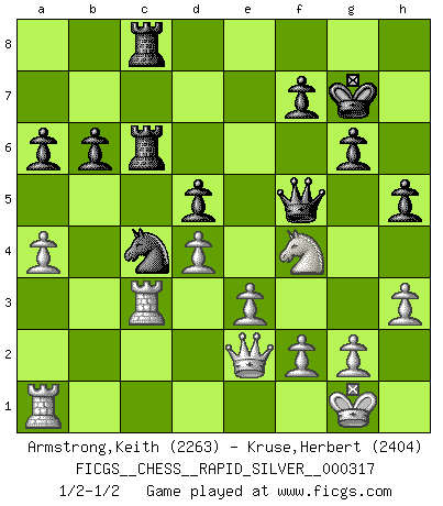 Last move : 1/2-1/2 2025 January 13 22:5:40 [Event "FICGS__CHESS__RAPID_SILVER__000317"] [Site "FICGS"] [Date "2024.11.20"] [Round "2"] [White "Armstrong,Keith"] [Black "Kruse,Herbert"] [Result "1/2-1/2"] [WhiteElo "2263"] [BlackElo "2404"] 1.Nf3 Nf6 2.c4 e6 3.Nc3 d5 4.d4 Bb4 5.Bg5 h6 6.Qa4+ Nc6 7.Bxf6 Qxf6 8.e3 O-O 9.Be2 Bxc3+ 10.bxc3 Bd7 11.cxd5 exd5 12.O-O b6 13.h3 Rfd8 14.Rfe1 Na5 15.Qd1 Bf5 16.Ne5 c5 17.Bd3 Bxd3 18.Nxd3 Rac8 19.a4 Qf5 20.Nf4 Rc6 21.Ra2 g6 22.Ra1 Kg7 23.Qe2 h5 24.Rac1 cxd4 25.cxd4 Nc4 26.Rc3 Rdc8 27.Rec1 a6 28.Ra1 Qe4 29.Rd1 Qf5 30.Ra1 Qe4 31.Rd1 Qf5 32.Ra1 1/2-1/2 Follow this game move after move (download)You sit at the board and suddenly your heart leaps. Your hand trembles to pick up the piece and move it. But what Chess teaches you is that you must sit there calmly and think about whether it's really a good idea and whether there are other better ideas. (Stanley Kubrick) Schach ist ein schwarz-weisser Dschungel. (Garry Kasparov) El Ajedrez es sobre todo, ¡una pelea!. (Emanuel Lasker) Les Echecs ne sont pas pour les âmes timides. Ils requièrent un homme entier, qui ne s'arrête pas aveuglément à ce qui a été déjà établi, mais qui tente individuellement de sonder les profondeurs du jeu. (W. Steinitz) Wisdom doesn't necessarily come with age. Sometimes age just shows up all by itself. (Tom Watson)