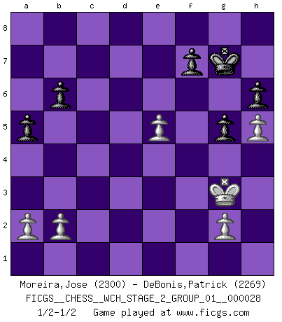 Last move : 1/2-1/2 2025 March 11 0:37:37 [Event "FICGS__CHESS__WCH_STAGE_2_GROUP_01__000028"] [Site "FICGS"] [Date "2024.11.25"] [Round "1"] [White "Moreira,Jose"] [Black "DeBonis,Patrick"] [Result "1/2-1/2"] [WhiteElo "2300"] [BlackElo "2269"] 1.e4 e5 2.Nf3 Nc6 3.Bb5 Nf6 4.O-O Nxe4 5.Re1 Nd6 6.Nxe5 Be7 7.Bf1 Nxe5 8.Rxe5 O-O 9.d4 Bf6 10.Re2 b6 11.Re1 Bb7 12.Bf4 Ne4 13.Qd3 d5 14.Nd2 c5 15.c3 Re8 16.Rad1 cxd4 17.cxd4 a5 18.Qe3 Re6 19.Be5 Bg5 20.f4 Bh4 21.Re2 Be7 22.Kh1 Nxd2 23.Rexd2 Rc6 24.Bb5 R6c8 25.f5 Ba6 26.Qg3 Bf8 27.Bxa6 Rxa6 28.f6 g6 29.h4 h6 30.Qd3 R6a8 31.Rf1 Rc6 32.Rf3 Rac8 33.Kh2 Re6 34.Rg3 Kh8 35.Qb5 Rc4 36.h5 g5 37.Rc3 Bb4 38.Rxc4 dxc4 39.Re2 Bd6 40.Qxc4 Qxf6 41.Bxd6 Rxe2 42.Qxe2 Qxd6+ 43.Qe5+ Qxe5+ 44.dxe5 Kg7 45.Kg3 1/2-1/2 Follow this game move after move (download)A Chess game is a dialogue, a conversation between a player and his opponent. Each move by the opponent may contain threats or be a blunder, but a player cannot defend against threats or take advantage of blunders if he does not first ask himself: What is my opponent planning after each move ? (Bruce A. Moon) Mein Gehirn das ist mein zweitwichtigstes Organ [Aus dem Film: Der Schläfer]. (Woody Allen) Preferería tener un Peón que un dedo. (Reuben Fine) Comme les marins qui ont mille raisons différentes d'aller en mer, les joueurs d'échecs en ont tout autant avant de s'installer devant une table et jouer... (Vincent Bertignac, philosophe) He is a liar. I just don't know what the lie is yet. (Horatio Caine, C.S.I. Miami)