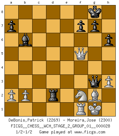 Last move : 1/2-1/2 2025 February 18 14:3:35 [Event "FICGS__CHESS__WCH_STAGE_2_GROUP_01__000028"] [Site "FICGS"] [Date "2024.11.25"] [Round "2"] [White "DeBonis,Patrick"] [Black "Moreira,Jose"] [Result "1/2-1/2"] [WhiteElo "2269"] [BlackElo "2300"] 1.d4 Nf6 2.c4 e6 3.Nf3 d5 4.Nc3 Bb4 5.Qa4+ Nc6 6.e3 O-O 7.Bd2 dxc4 8.Bxc4 Bd6 9.O-O e5 10.dxe5 Nxe5 11.Nxe5 Bxe5 12.Qc2 c6 13.h3 Bc7 14.Rad1 Qe7 15.f4 b5 16.Bd3 Rd8 17.Ne4 Nd5 18.Nf2 h6 19.Qxc6 Bb6 20.Qxb5 Nxe3 21.Bxe3 Qxe3 22.Be4 Bxh3 23.Rxd8+ Rxd8 24.gxh3 Qxf4 25.Qf5 Qg3+ 26.Bg2 Rd2 27.Qc8+ Kh7 28.Qf5+ Kg8 29.Qc8+ Kh7 30.Qf5+ Kg8 1/2-1/2 Follow this game move after move (download)Chess opens and enriches your mind. (Saudin Robovic) Es gibt nur zwei wahre Schachgenies - das andere war Wilhelm Steinitz, der Weltmeister von 1872 bis 1894. (Robert James Fischer) El Ajedrez es realmente noventa y nueve por ciento calculación. (Soltis) Si le désir cupide (et stupide) de gagner est une inépuisable source de souffrance, une combinaison brillante sur l'échiquier est une découverte : le coquelicot qui s'épanouit lorsque apparaît la Voie Lactée. (Arrabal) When a man with money meets a man with experience, the man with experience leaves with money and the man with money leaves with experience. (Anonymous)